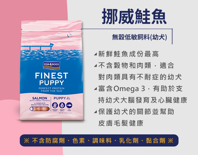 ● 新鮮鮭魚成份最高●不含穀物和肉類,適合對肉類具有不耐症的幼犬●富含Omega 3,有助於支持幼犬大腦發育及眼睛和心臟健康●保護幼犬的關節並幫助皮膚毛髮健康本產品為全天然食品,顆粒顏色差異是正常現象,請安心食用。 不含防腐劑、色素、調味料、乳化劑、黏合劑。