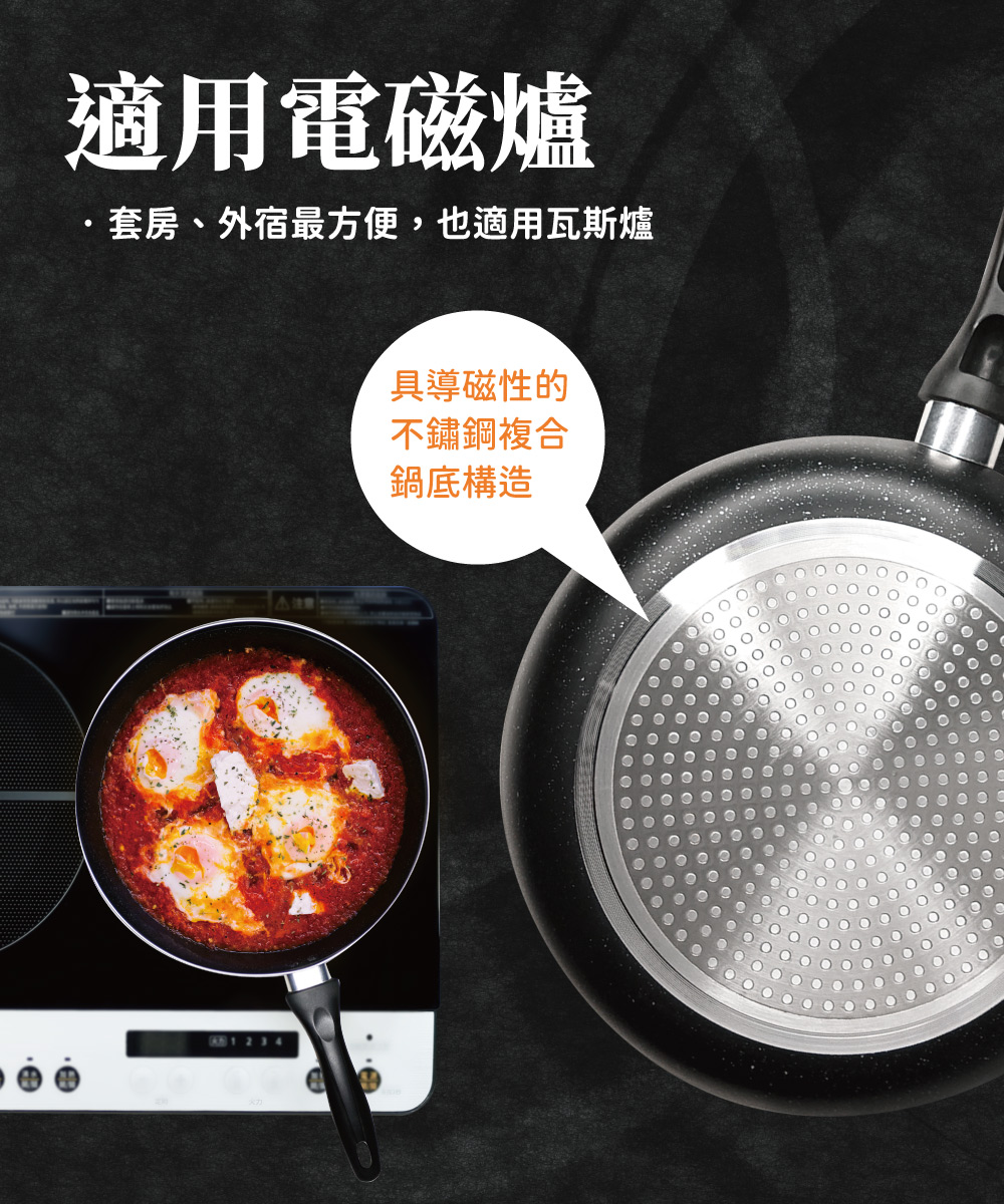 ※導磁性不鏽鋼底盤,適用電磁爐、瓦斯爐、陶瓷爐,並使鍋底更堅固耐用