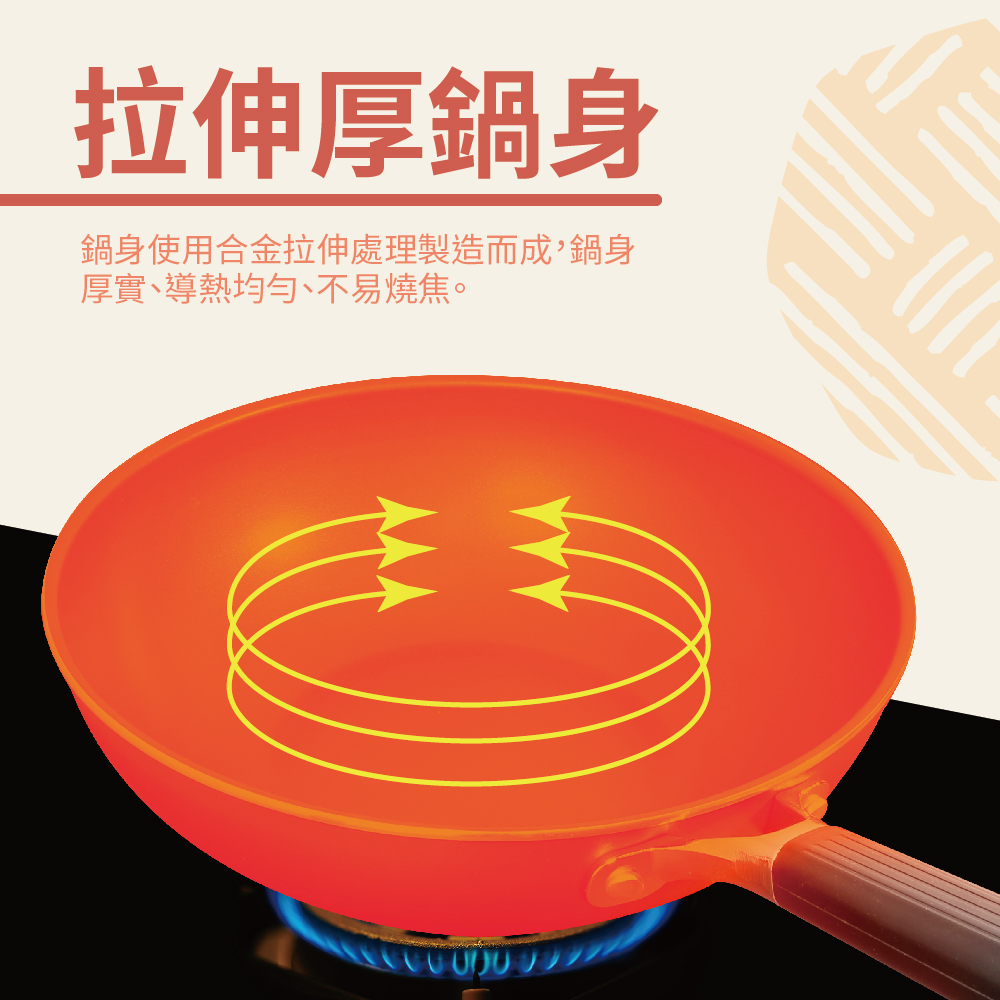 ※使用合金拉伸處理製造而成,鍋身厚實導熱均勻,不易燒焦。