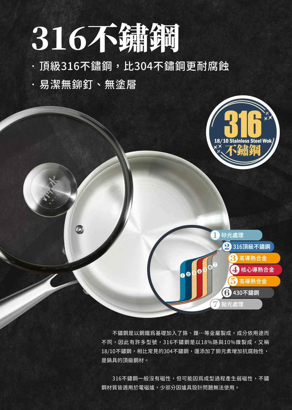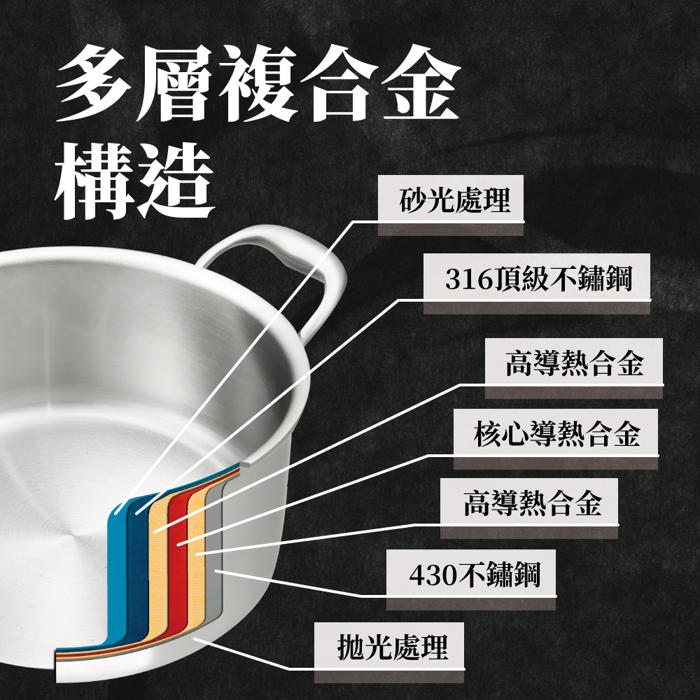 ◆鍋身材質:內層採用316不鏽鋼,外層採用430導磁性不鏽鋼。