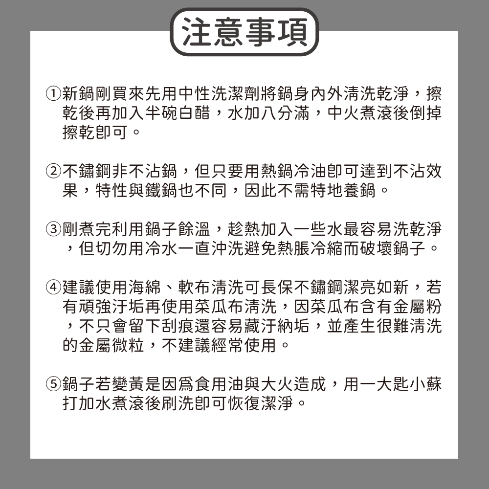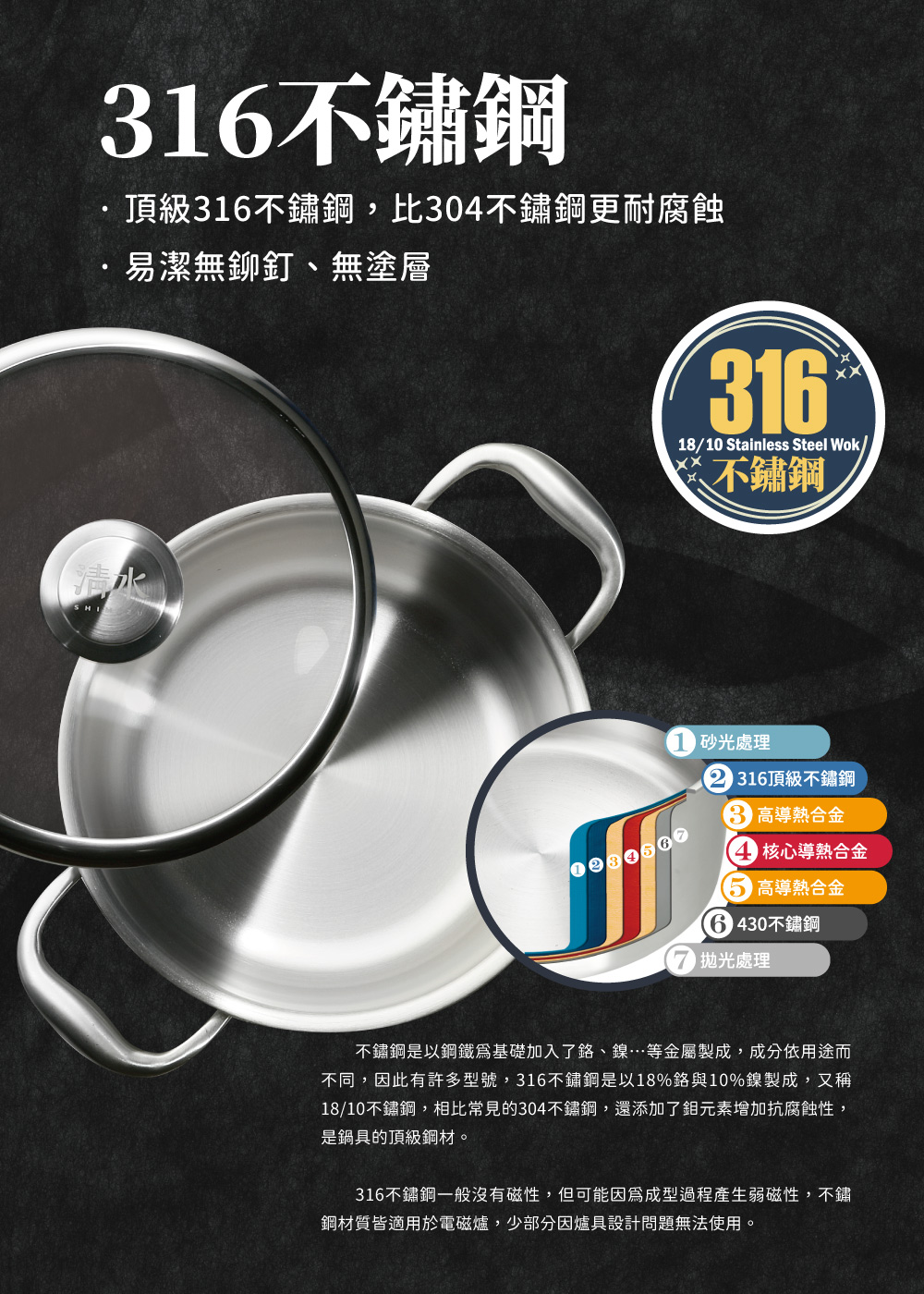 ◆鍋身材質:內層採用316不鏽鋼,外層採用430導磁性不鏽鋼。