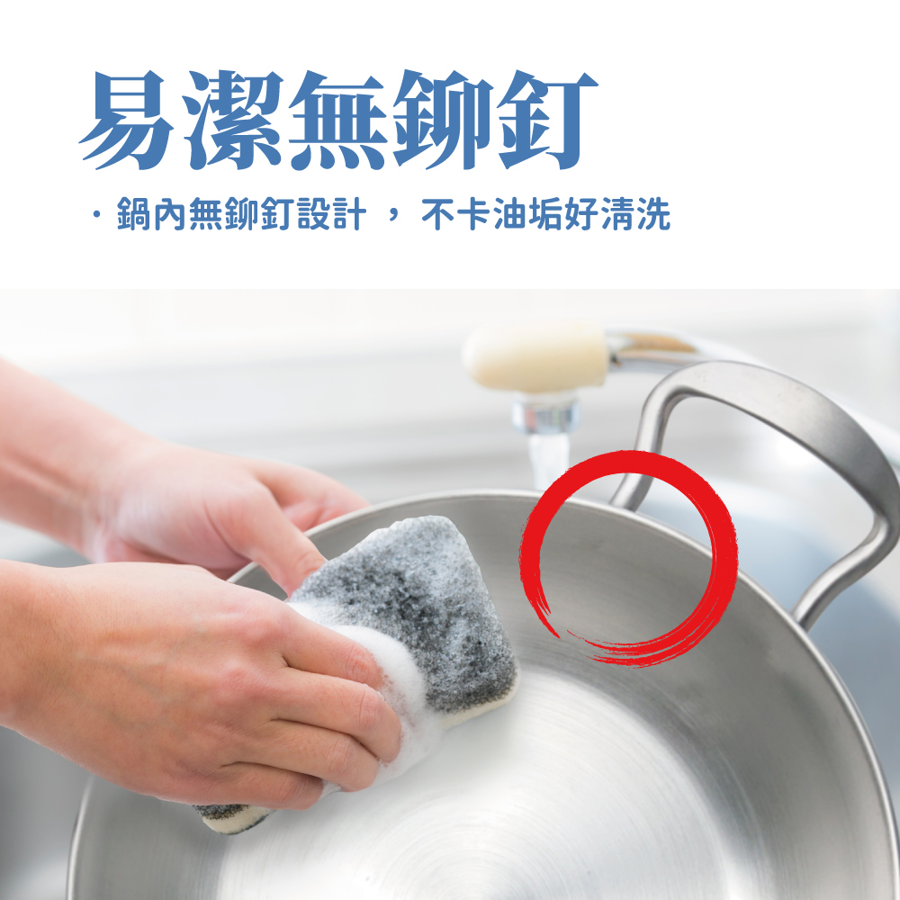 ※鍋內無鉚釘設計,不卡油垢好清洗。
