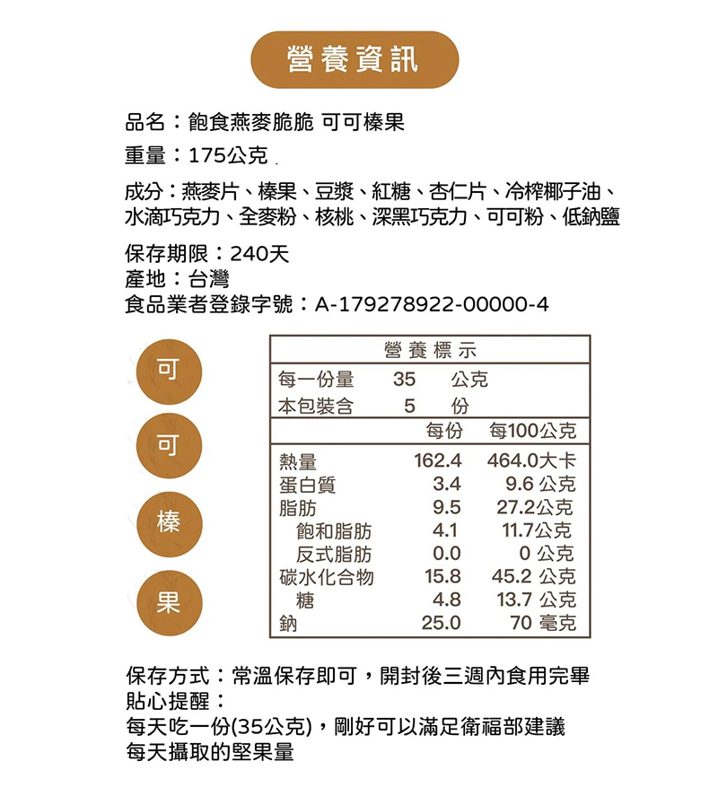 每一份量 35 公克 本包装含 5份 每份 每100公克 熱量 162.4 464.0大卡 蛋白質 3.4 9.6公克 脂肪 9.5 27.2公克 飽和脂肪 4.1 11.7公克 反式脂肪 0.0 0.0 公克 碳水化合物 15.8 45.2 公克 糖 4.8 13.7公克 鈉 25.0 70毫克