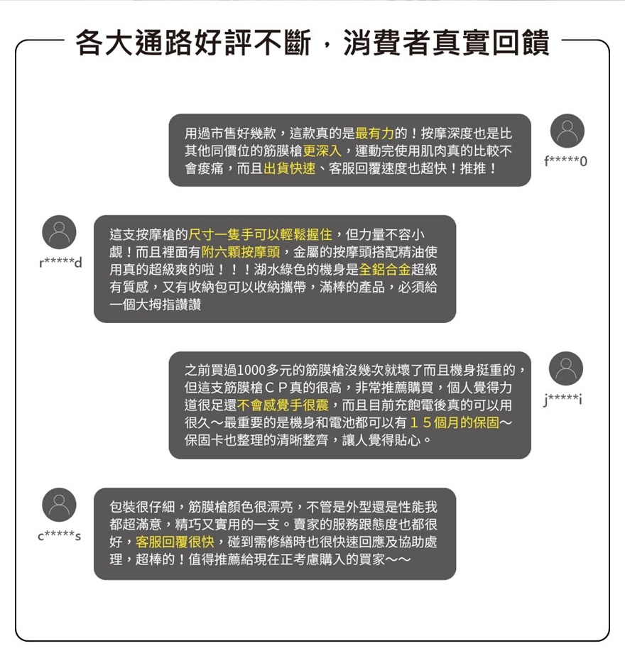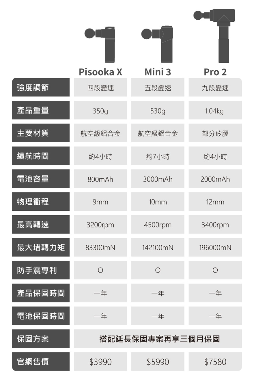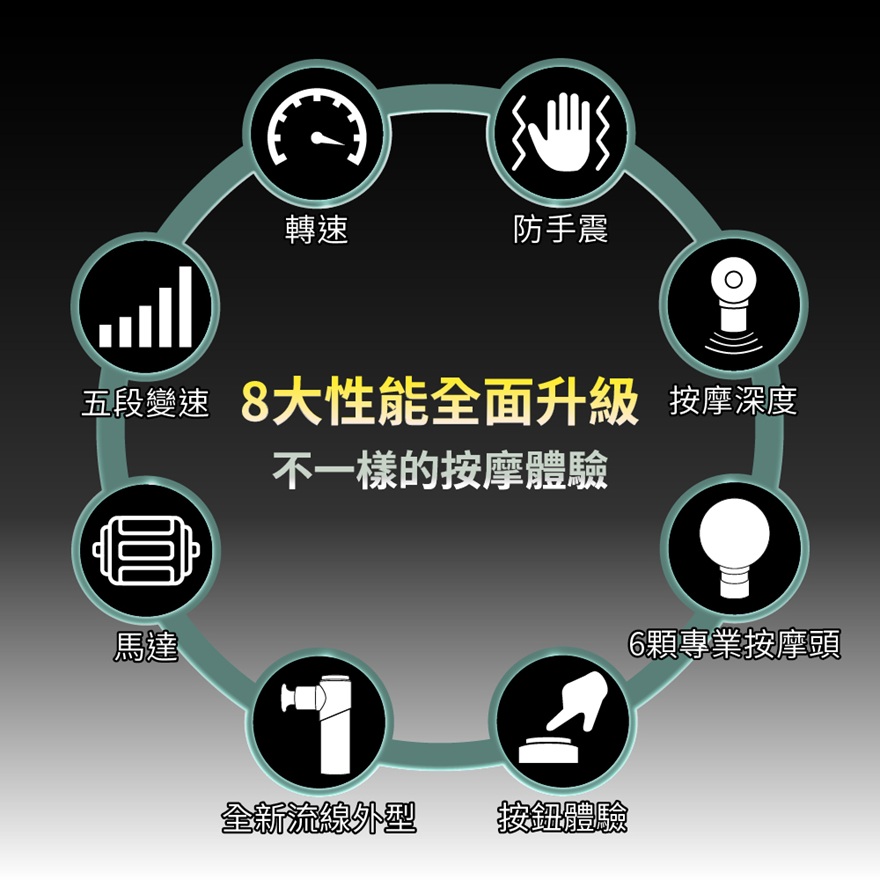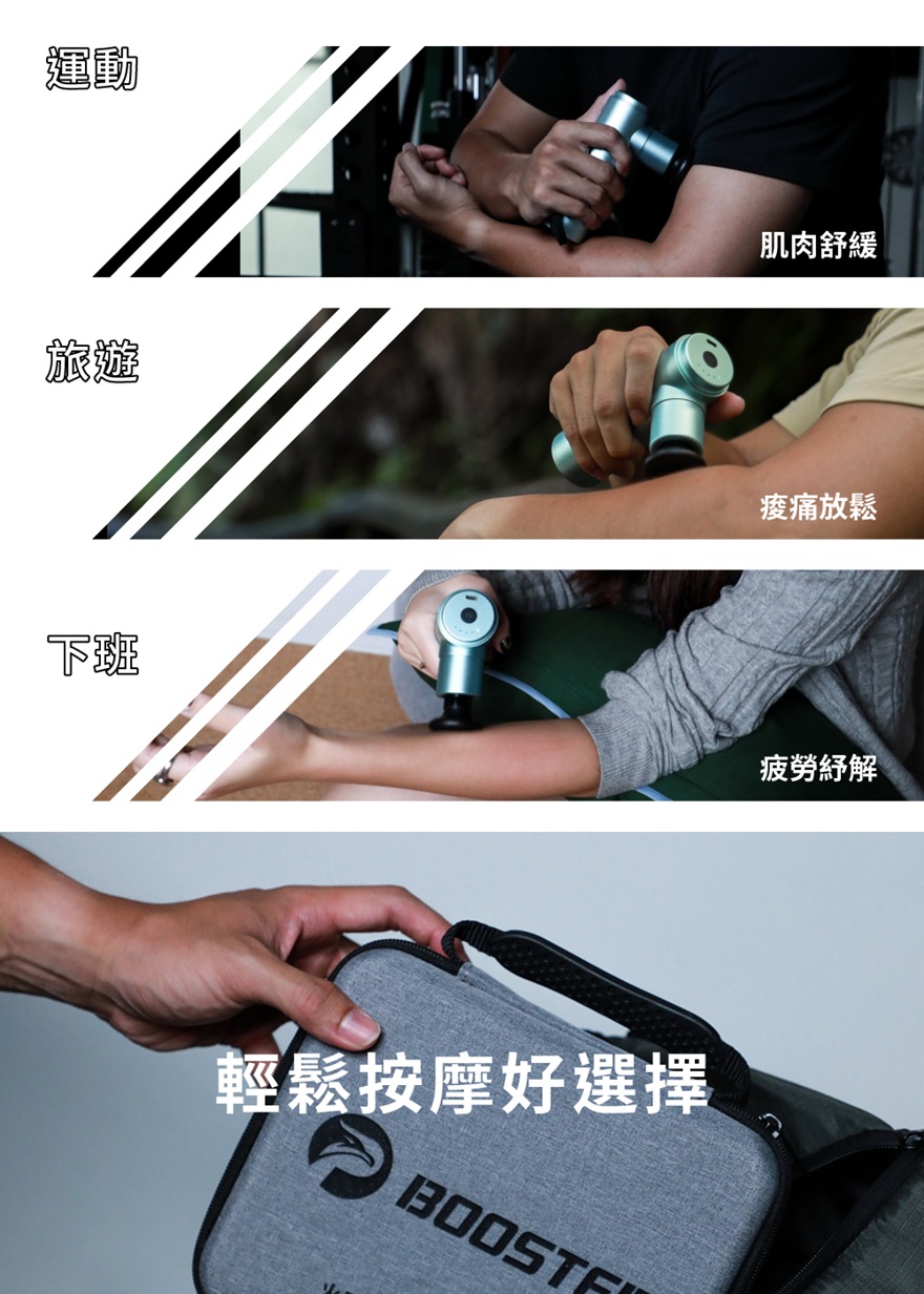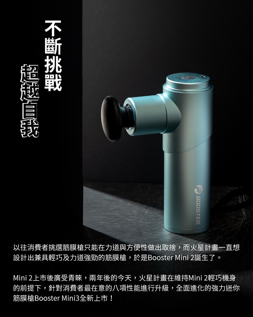 針對消費者最在意的8大性能升級馬達升級、力道超強 ,10mm直擊痛點內附6顆專業按摩頭,精準滿足全身各式痠痛機身、電池皆享有12+3月保固,只換不修採Booster獨特防手震專利,降低手腕負擔全鋁合金材質,青峰綠質感上市!