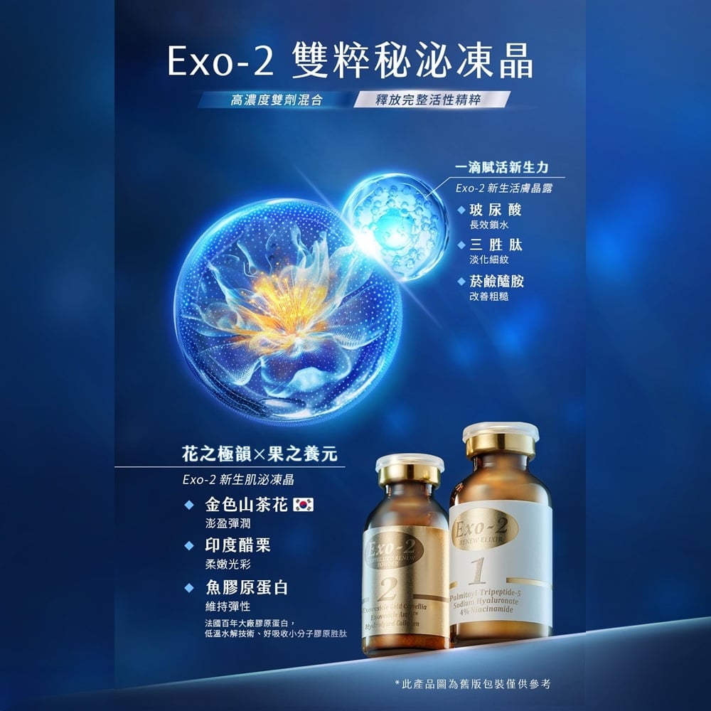 主要成分:金色山茶花外泌體、黃金果(余甘子)外泌體、胜肽、玻尿酸、菸鹼醯胺(維他命 B3)