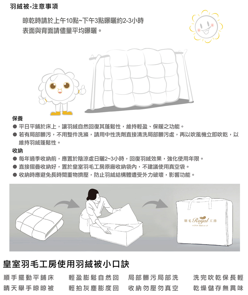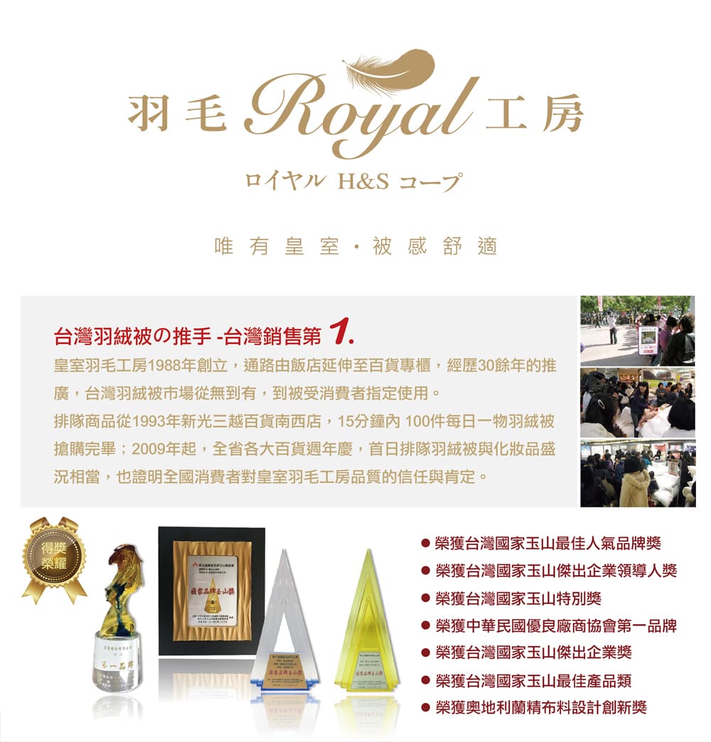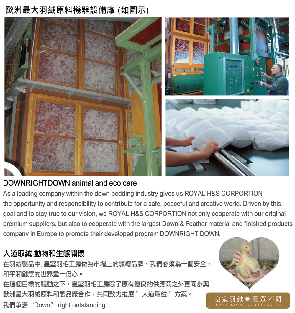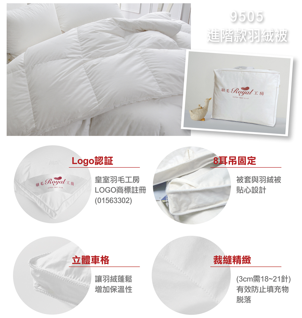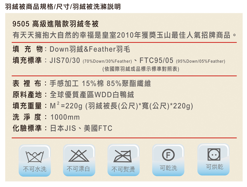 ◎ 工匠級3公分內21針,精緻車縫◎ 精選100% 棉,含防絨處理◎ 天然最輕保暖材質,輕感享受,不壓迫◎ 立體車格設計,羽絨更蓬鬆、保暖,快速升溫,迅速入眠◎ 八耳吊固定,羽絨被與被套更合貼◎ 手腳不再冰冷,睡的更健康◎ 天然商品符合節能環保概念表 裡 布:手感加工 15%棉 85%聚酯纖維尺 寸:182*212cm原料產地:全球優質產區WDD白鴨絨填 充 物:Down羽絨&Feather羽毛填充標準:FTC95/05(95%Down/05%Feather)、JIS70/30(70%Down/30%Feather)重 量:M2=220g (羽絨被長(公尺)*寬(公尺)*220g)