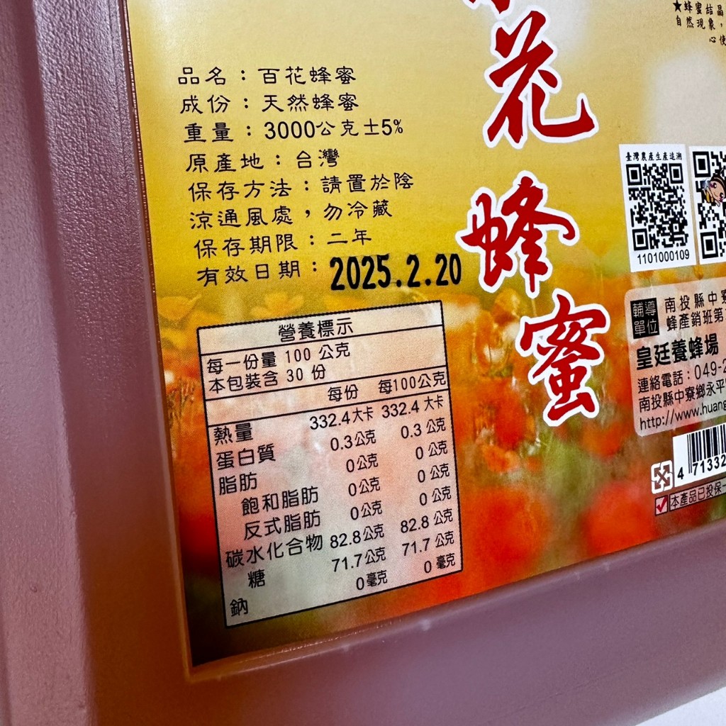 內容物/規格:百花蜂蜜--3000g/桶保存期限:兩年成份:純蜂蜜產地:台灣採自南投地區無污染之野花野草,味道清香口感滑順!!保存方式:請置於陰涼通風處食用方式:沖泡蜂蜜時可以冷水或溫開水沖調,甜度依個人喜好調配,若加入牛奶.咖啡或果汁飲用,口感更香醇美味,亦可調製西點及配合藥膳食用!建議事項: 因幼兒腸道尚未發育完全,不建議一歲以下幼兒吃蜂蜜。說明:蜂蜜具有結晶的特性,當低溫14~15度C時,蜂蜜中的葡萄糖最容易析出產生結晶,此乃正常現象!惟此結晶細膩.柔軟.入口易化,與劣蜜的結晶體較粗.有砂粒感.入口難化的現象差異有很大差別!保存期限:兩年(純蜂蜜能長久保存但香氣會慢慢流失)