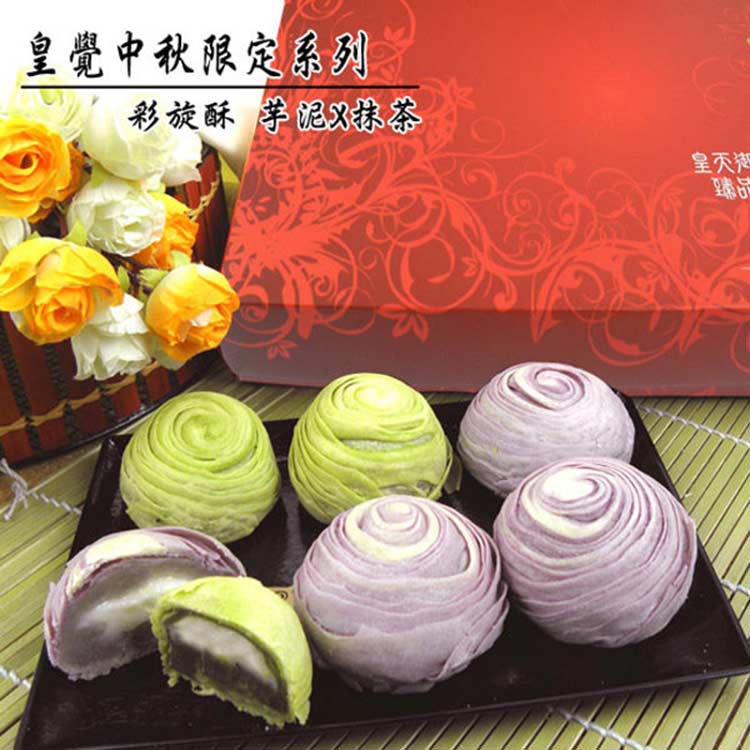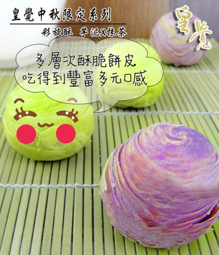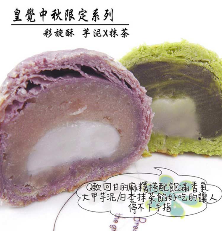 商品口味: 蛋黃酥-烏豆沙 廣式小月餅-烏豆沙、棗泥、咖啡、蓮蓉 彩旋酥-日式抹茶、甲仙芋泥