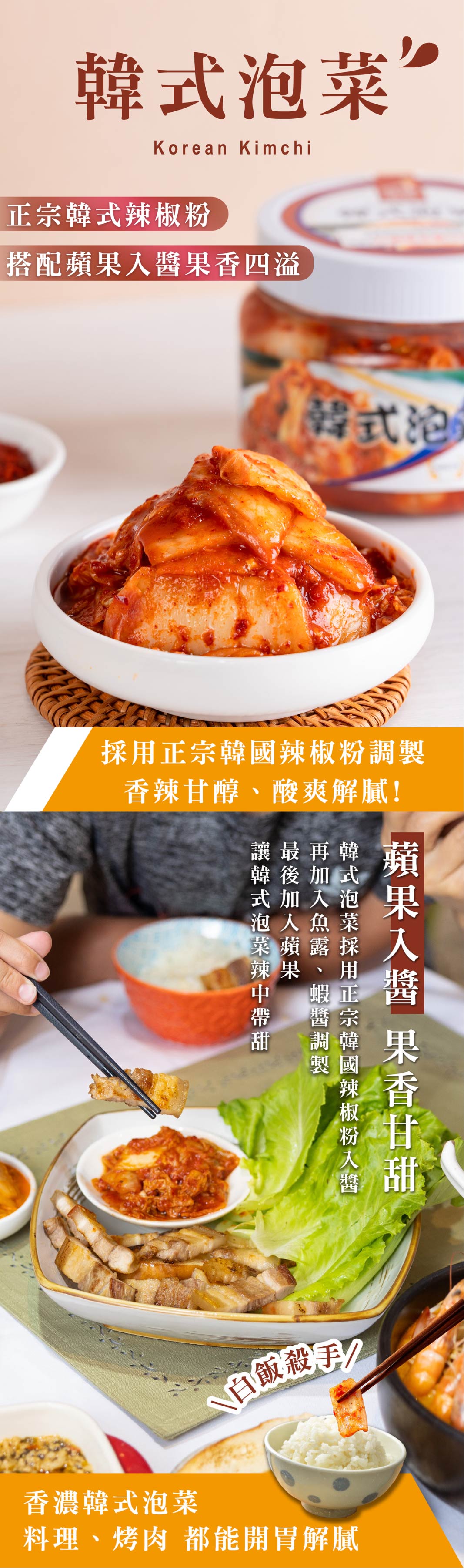 採用蘋果、洋蔥…等等蔬果入醬,香辣的韓式風味中散發著微微的果香的,入口能感受到酸香辣的風味、香辣回甘。隨著時間發酵,泡菜帶著自然發酵的酸度,不論是做成泡菜年糕、泡菜炒肉片或是做成泡菜火鍋都非常適合喔!