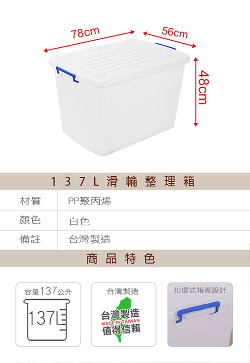 商品特色:■市場唯一可當儲水的收納箱!!■缺水時代來臨!!收納箱也可以當作儲水好幫手。■材質加厚,側邊附有扣環,不用擔心容易破損。■除了可以收納換季商品外,也可當作儲水箱功能。■商品可以向上堆疊,不用擔心太占位置。■底部有滑輪,推來推去也不用擔心太費力!■130L大容量放置冬天厚衣、棉被皆適宜。■百分百台灣製造生產,材質堅韌耐用,品質優良!■共有六種規格可選,可任意搭配使用,讓您收納更完善。商品規格: