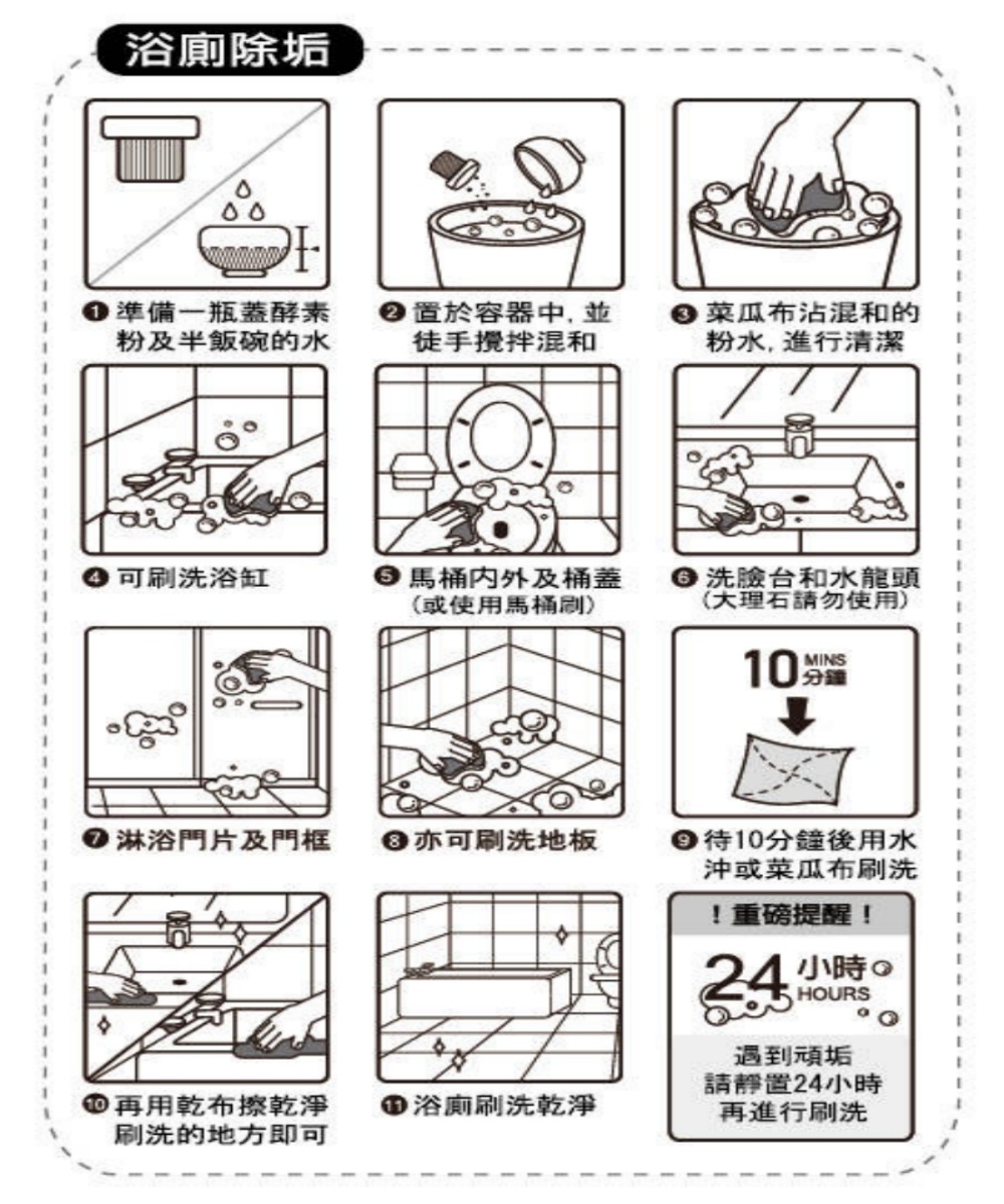 【成份】枸櫞酸、植萃酵素、礦物粉【使用方式】1.粉:水約1:15(粉35克:水500cc)將酵素與清水混合。40度溫水效果最好合。2.以抹布浸泡後清洗或使用高壓噴瓶噴灑後靜置10-30分鐘。3.刷洗注意事項:1、請勿食用2、如不慎與眼睛接觸,應立刻用大量清水沖洗3、請勿存放在陽光直射、潮濕的地方,勿將本品置於幼童伸手可及之處4、避免使用於大理石5、產品皆為機器&人工分裝,會造成 ± 5% 重量誤差,屬正常現象6、拆封拆箱拆袋請錄影,售後以完整錄影檔為主7、超商限重 5kg (也就是5000g),超過請拆訂單分成兩件寄出或者選擇貨運出貨產地:台灣保存期限:5年旗下產品定期主動送至SGS檢驗,通過化粧品衛生法規檢測,不含類固醇、抗生素、無抗藥性、不含重金屬 、塑化劑、不含螢光增白劑、抗菌劑、防腐劑、無酒精、香精與甲醛,市售TKP產品與送驗品成份相同,嚴格把關品管過程 ,有別於傳統化工洗劑