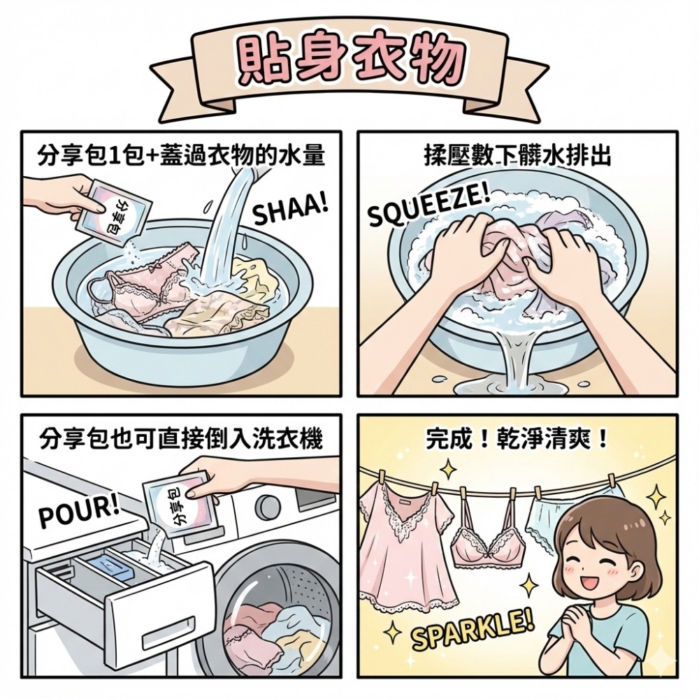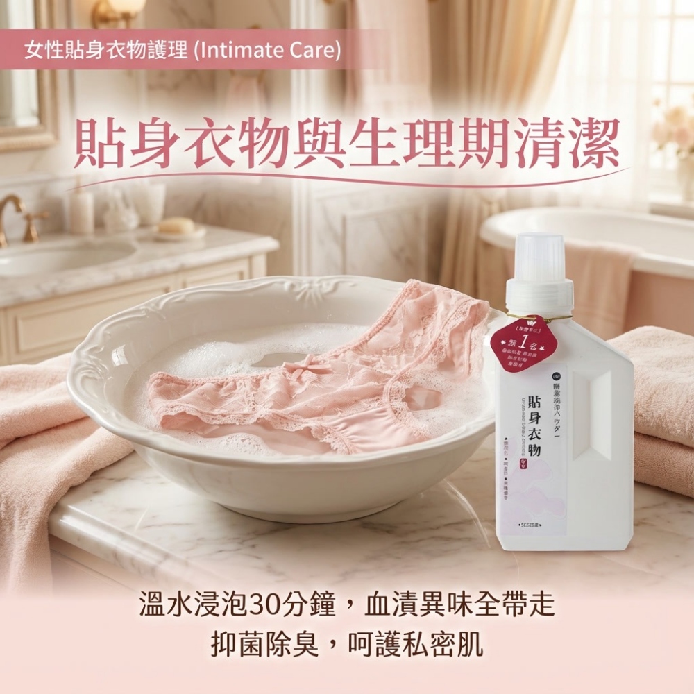 貼身衣物以小臉盆容量約10g酵素比例,若遇生理期建議以溫水浸泡約30分鐘後手洗清洗即可