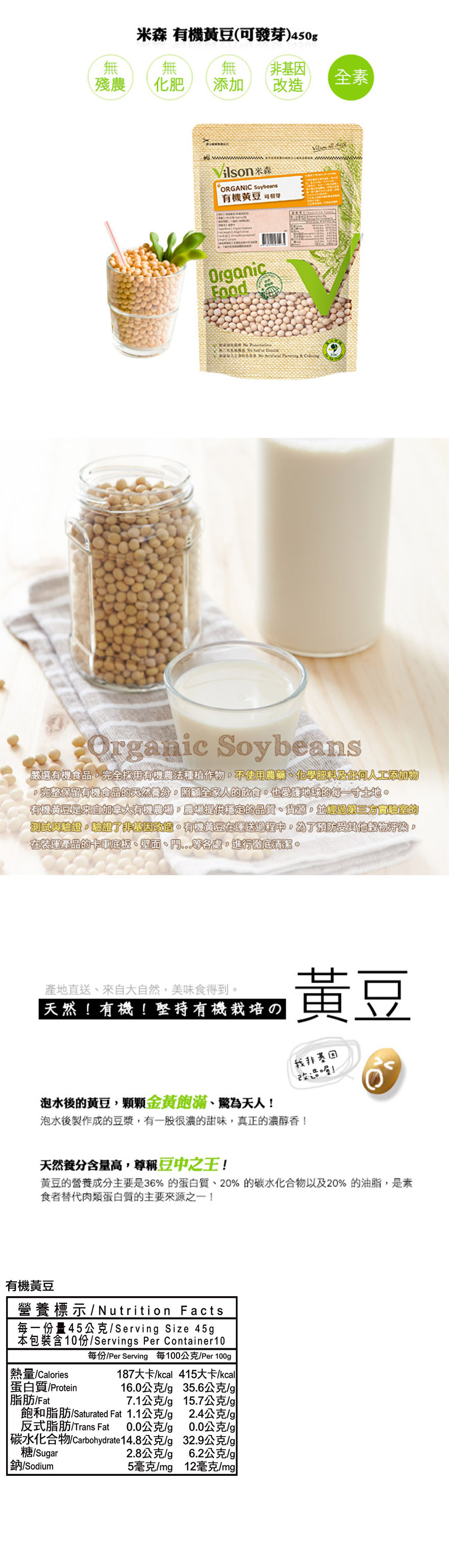 ★商品特色有機級無添加防腐劑、人工香料及色素保證不使用農藥、化學肥料及人工添加物高蛋白質(可發芽) 、非基因改造黃豆★銷售重點嚴選有機食品,完全採用有機農法種植作物,不使用農藥、化學肥料及任何人工添加物,完整保留有機食品的天然成份。有機黃豆是來自有機農場,農場提供穩定的品質、貨源,並經過第三方實驗室的測試與驗證,驗證了非基因改造。有機黃豆的蛋白質約有39%,並達到90%的高發芽率。