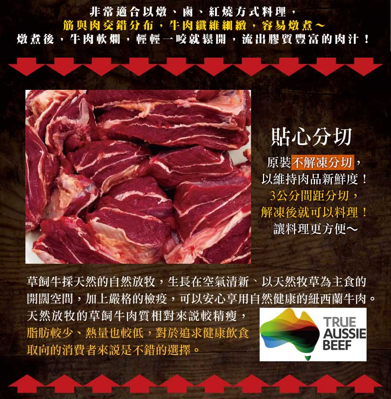 保存方式 冷凍-18℃以下食用方式 各式料理內容物成份 牛肉熱量 可免標示每份營養成份 可免標示內容量 ( g/ml ) 500g+-10%/包食品添加物名稱 無產地(國家或台灣縣市) 澳洲廠商名稱 豪鮮食品廠商電話號碼 07-3650350廠商地址 高雄市大社區旗楠路88號保存期限 如包裝所示製造日期/有效日期 如包裝所示投保產品責任險字號 150310PD03743食品業者登錄字號 E-183128073-00000-4