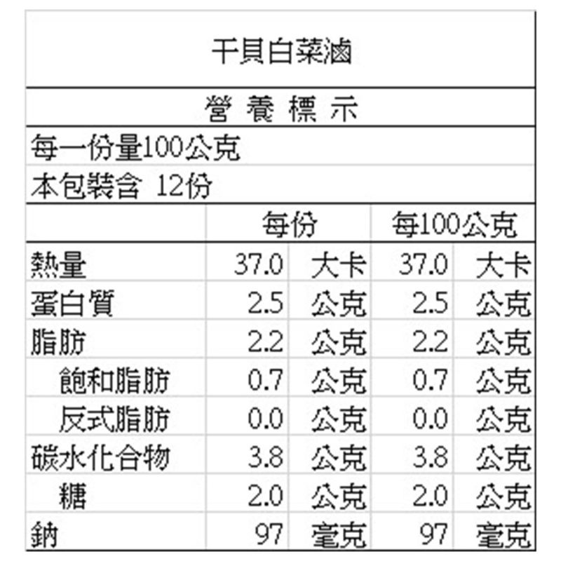■內容物成分(全展開),成分有豬及牛的需於背後標註產地: 水、大白菜、珠貝、豬皮、蝦米、扁魚、香菇、金針菇、黑木耳、蒜末、紅蘿蔔、蛋、豬肉絲、鹽巴、豬油、大豆油 食品添加物:味精(L-麩酸鈉、5’-次黃嘌呤核苷磷酸二鈉、5’-鳥嘌呤核苷磷酸二鈉、粘稠劑(羧甲基纖維素鈉))豬肉產地:台灣