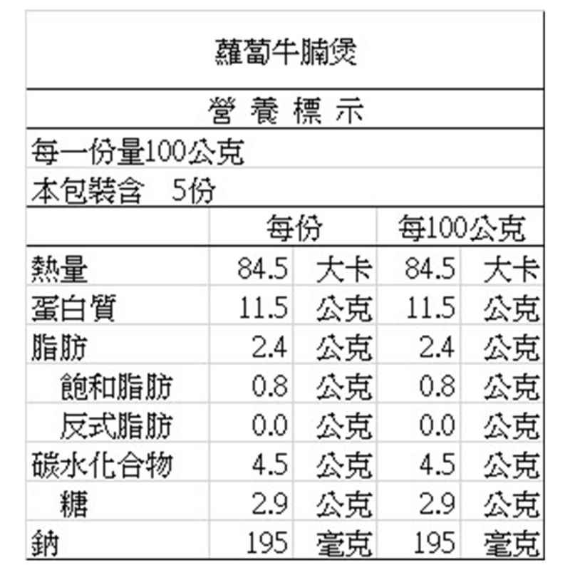■內容物成分(全展開),成分有豬及牛的需於背後標註產地: 牛腩(巴拉圭) 、水、白蘿蔔、醬油、冰糖、青蔥、米酒、薑、番茄醬(蕃茄、水、糖、食鹽、醋、香辛料)、香油(大豆油、芝麻油)、大豆油、八角、鹽