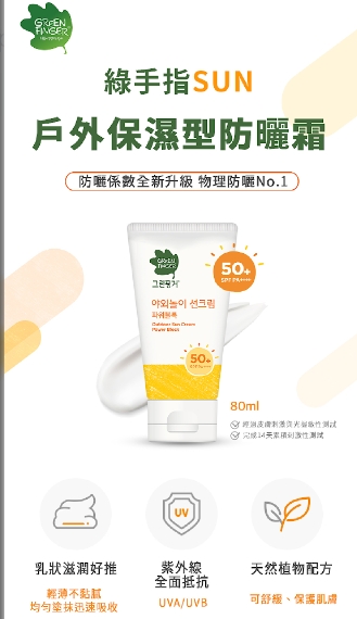 【綠手指 GreenFinger】幼兒戶外保濕滋潤防曬乳80ml SPF50,PA++++/可擦臉/友善海洋