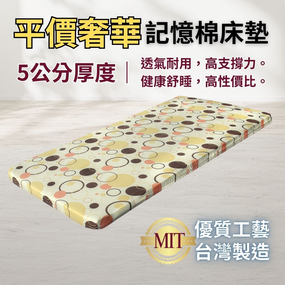 產品介紹: 平價奢華5公分記憶床墊是一款專為追求舒適睡眠體驗的消費者設計的高性價比床墊。這款床墊採用了高品質的記憶棉材料,能夠貼合人體曲線,提供精確的支撐和壓力釋放,讓您在睡眠中得到充分的放鬆和休息。5公分的厚度既保證了床墊的舒適性,又不會增加過多的重量,使其便於搬運和使用。這款記憶床墊以平價的定位,為您帶來奢華的睡眠體驗。 產品特點: 適壓記憶棉:床墊採用優質記憶棉材料製成,能夠根據體溫和體重自動調整,完美貼合身體曲線,提供精準的支撐,減少壓力點,讓您在睡眠中感受無與倫比的舒適。 添加竹炭 :多孔質特性具強大吸附、調節、淨化、消臭 5公分厚度:5公分的厚度設計提供了適度的舒適性與支撐力,既能有效改善床墊的質感,又不會過於厚重,適合各類床架使用。 平價奢華:該床墊以平實的價格定位,提供了高端記憶棉床墊的舒適體驗,是追求經濟實惠的消費者的理想選擇。 壓力釋放:記憶棉具有優秀的壓力分散效果,能有效減少壓力集中於肩膀、腰部等部位,改善血液循環,幫助減輕疼痛和壓力,提升睡眠品質。 透氣舒適:床墊表層採用透氣材料,搭配記憶棉內芯,有效排濕透氣,保持睡眠過程中的乾爽舒適。 適用範圍:適合所有年齡層