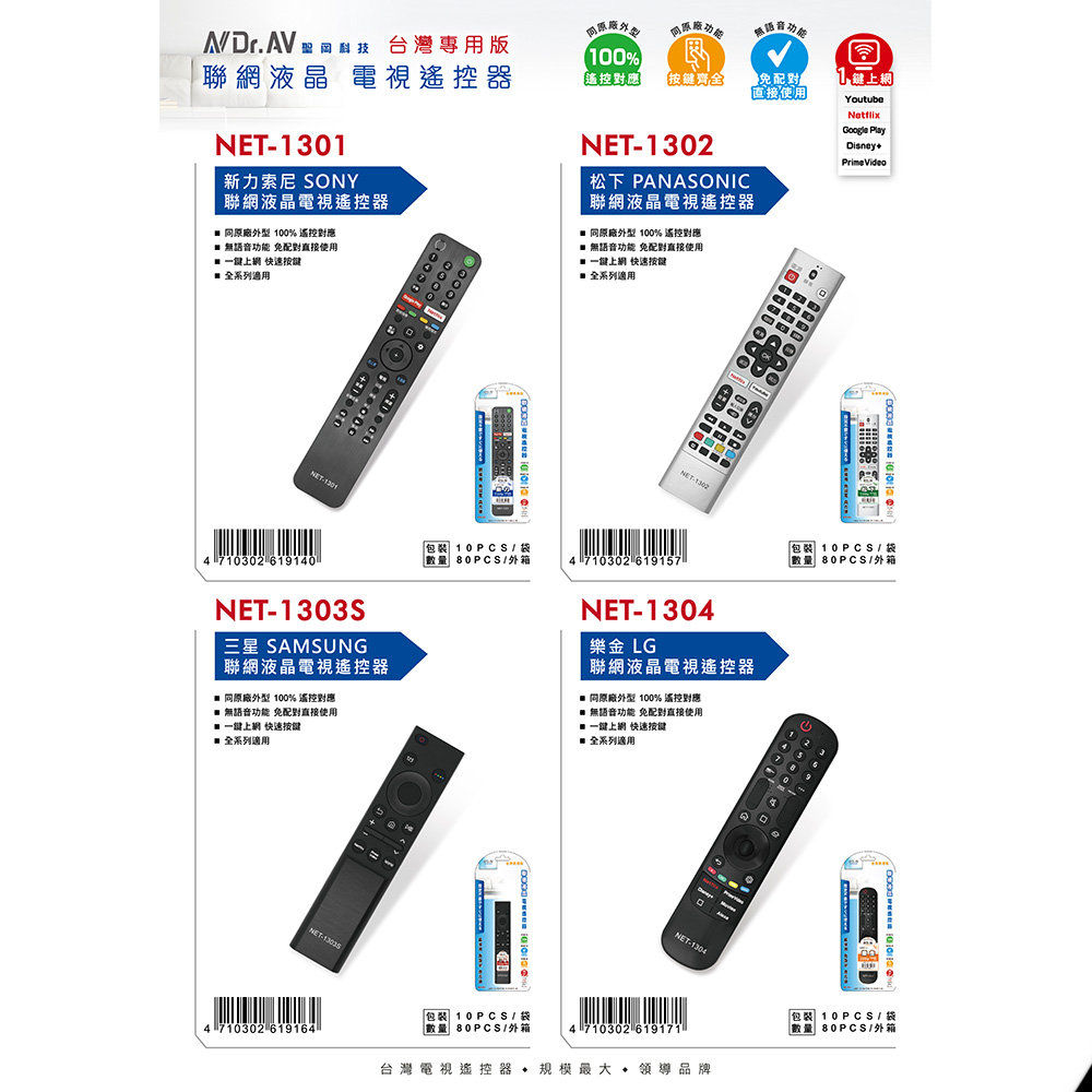 ▼商品介紹 品名:聯網液晶電視遙控器 適用品牌:Samsung三星 型號:NET-1303S 遙控角度:上下左右約30度 遙控距離:約8公尺 材質:ABS塑料 使用電池:4號(AAA)×2顆(請另購) 產地:中國