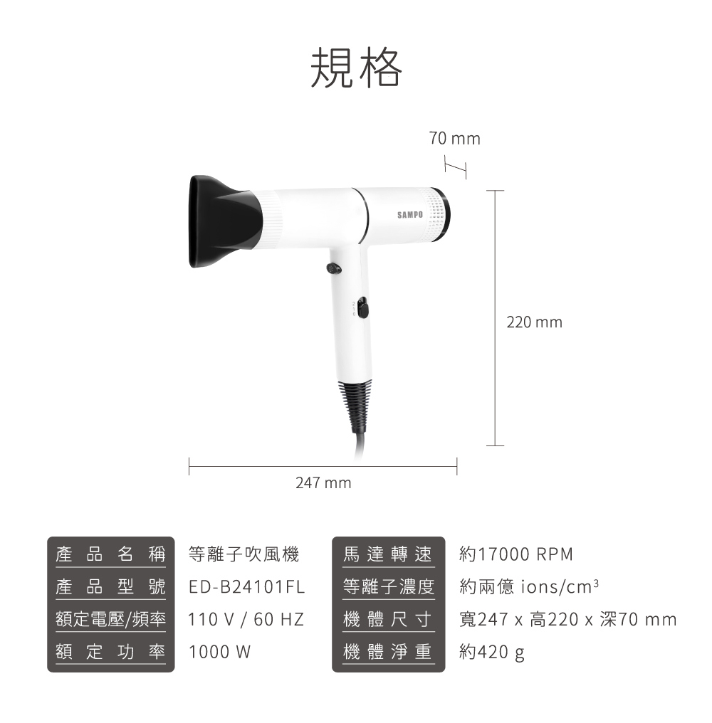 420G羽量級設計,輕鬆吹風造型