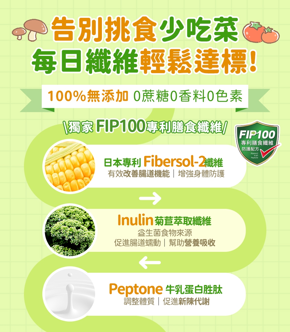難消化性麥芽糊精(Fibersol-2)、菊糖(Inulin)、牛乳蛋白(Peptone)