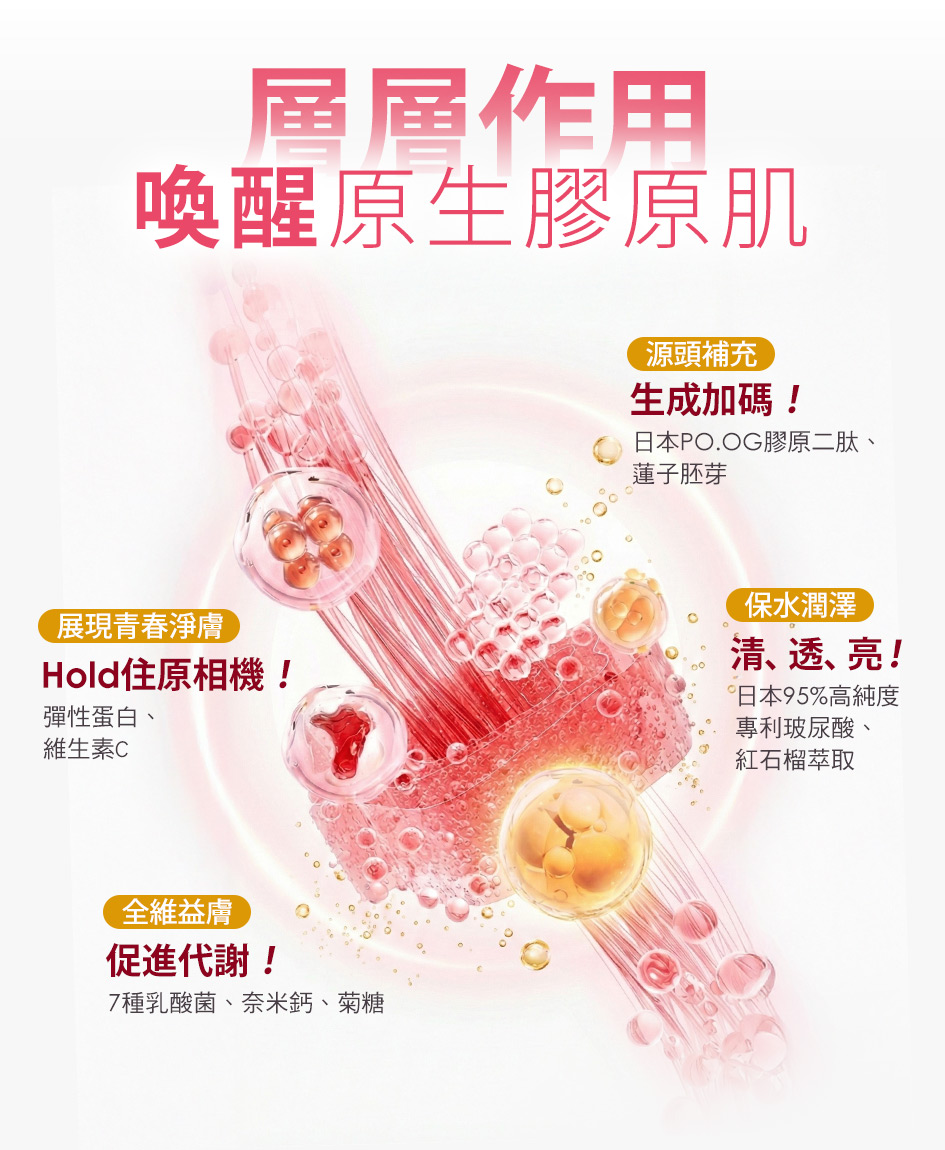 ★潤澤Q彈提升↗380% ★日本專利膠原二肽X專利紅石榴X日本專利彈性蛋白X日本大廠玻尿酸★四大美妍成分,感受潤澤,重啟青春美麗