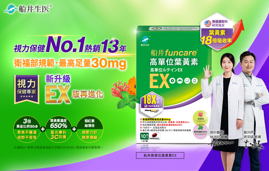 金盞花萃取【葉黃素20%、麥芽糊精、美國專利FloraGLO®金盞花葉黃素〔紅花籽油、葉黃素、生育醇(維生素E)、(抗氧化劑)〕、玉米黃素20%】、魚油、專利雨生紅藻萃取(含蝦紅素)、亞麻仁籽油、脂肪酸甘油酯、山桑子萃取、大豆卵磷脂、專利綠薄荷萃取物、枸杞萃取物、維生素E、維生素B6、維生素B12、維生素A