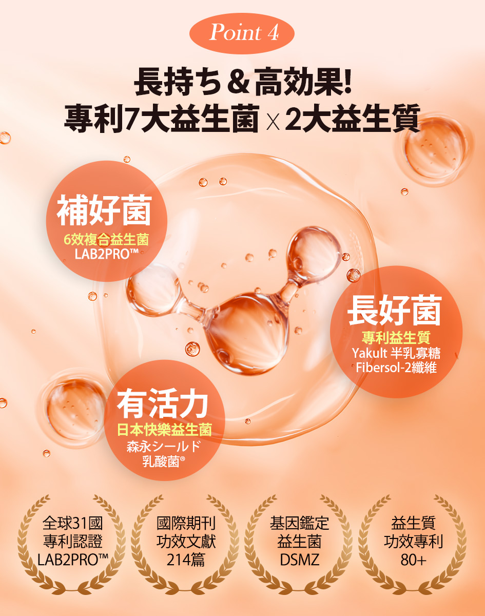 玉米來源可溶性纖維、麥芽糊精、植物乳桿菌Lactobacillus plantarum N13、半乳寡糖、熱去活型瑞士乳酸桿菌Lactobacillus helveticus MCC1848、乳酸菌粉(酪蛋白乳酸桿菌Lactobacillus casei LC5、比菲德氏雷特氏菌 Bifido-bacterium lactis BL3、植物乳桿菌Lac-tobacillus plantarum LP3、鼠李糖乳桿Lactobacillus rhamnosus LR5、海藻糖、玉米澱粉)、熱去活型植物乳桿菌Lacto