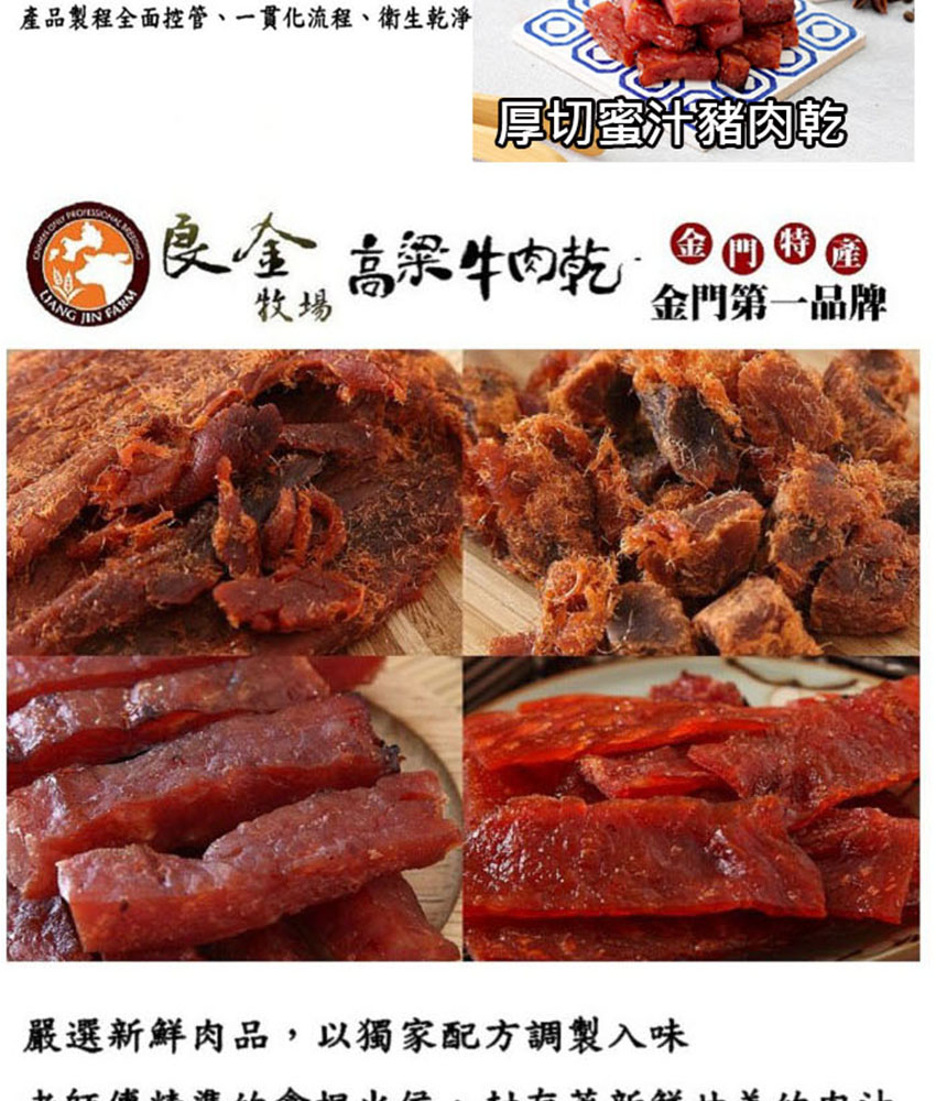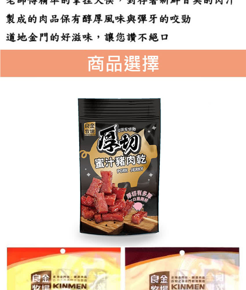 厚切蜜汁豬肉乾:精選豬肉、糖、醬油、鹽、高梁酒(高粱、小麥)、肉桂、甘草