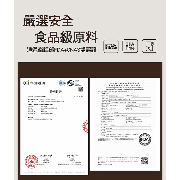 使用食品級原料,不含雙酚A,無螢光劑,健康無異味,通過FDA安全認證。