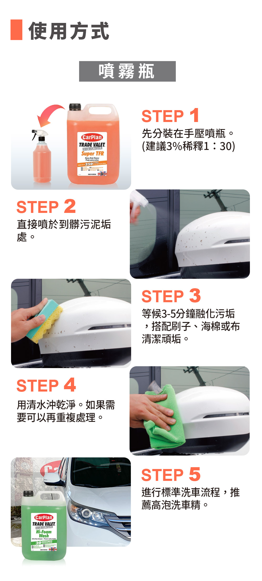 使用方法.噴霧瓶1.先分裝在手壓噴瓶。(建議3%稀釋1:30)2.直接噴於到髒污泥垢處。3.等候3-5分鐘融化污垢,搭配刷子、海棉或布清潔頑垢。4.用清水沖乾淨。如果需要可以再重複處理。5.進行標準洗車流程,推薦高泡洗車精。.洗車機1.倒在洗車機噴壺中。2.直接噴於到髒污泥垢處。3.等候3-5分鐘融化污垢。4.搭配刷子、海棉或布清潔頑垢。5.用清水沖乾淨,如果需要可以再重複處理。