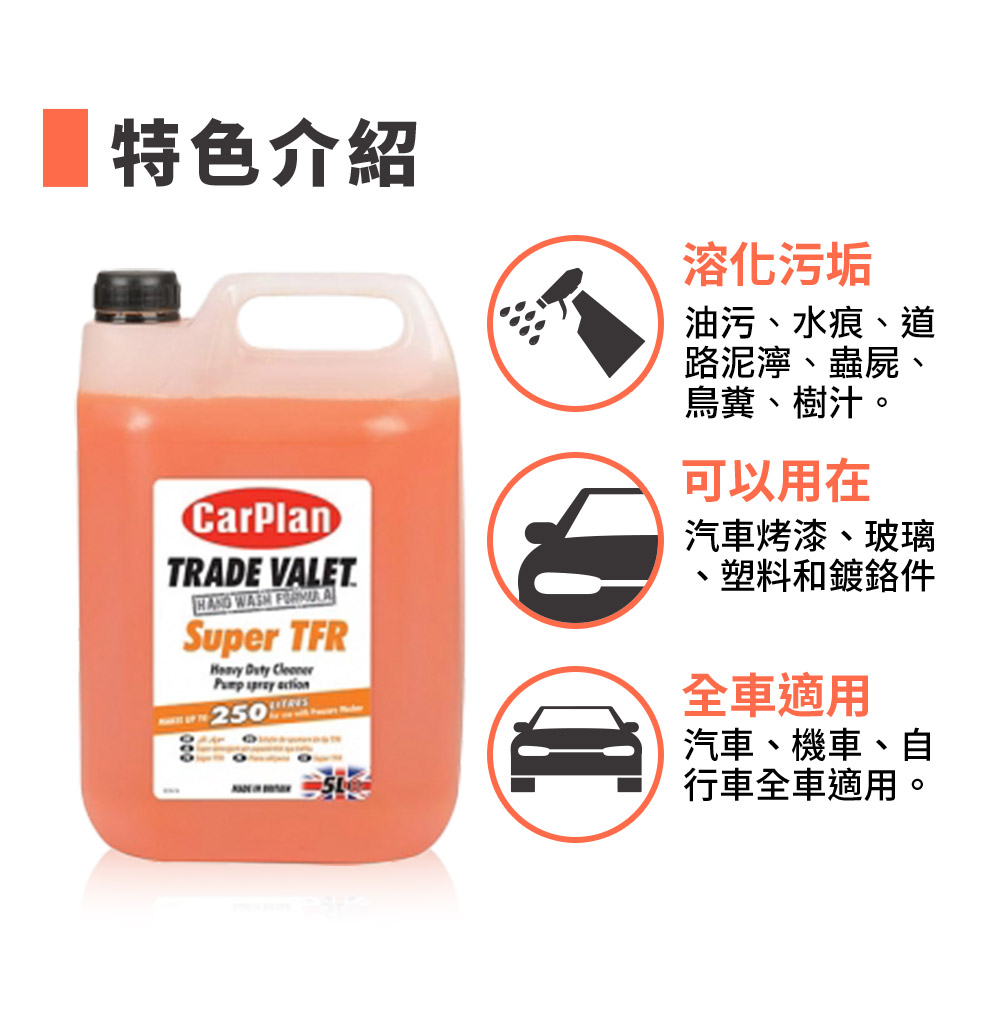 規格說明. 品牌:CarPlan卡派爾. 品名:TRADE VALET Super TFR 頑垢清潔劑. 成分:Phosphates、Non-ionic surfactants、Perfumes. 包裝:5公升/桶. 產地:英國