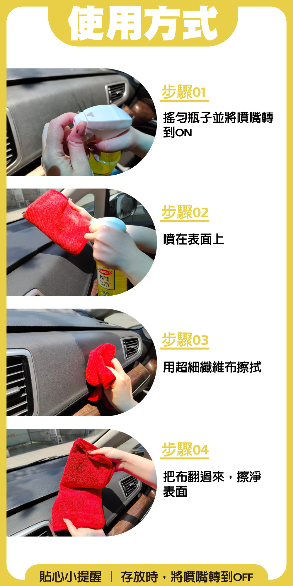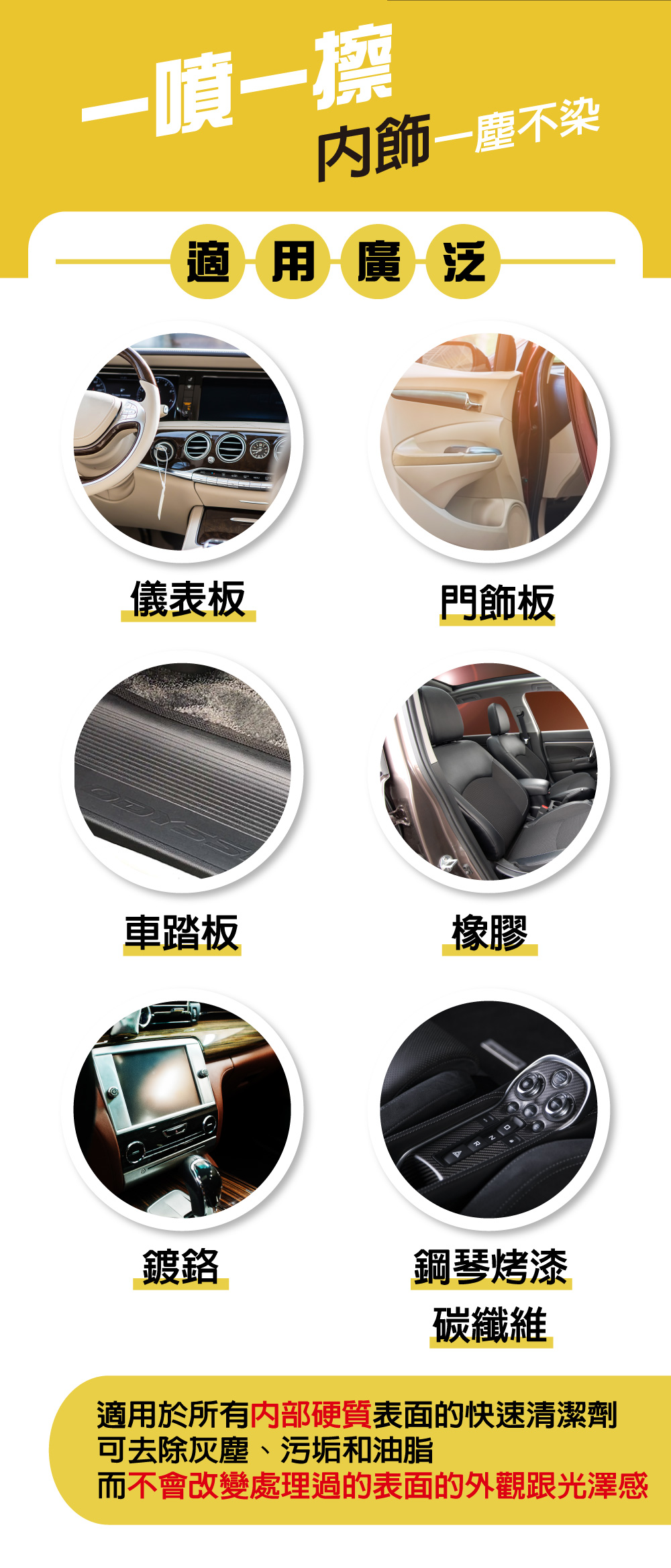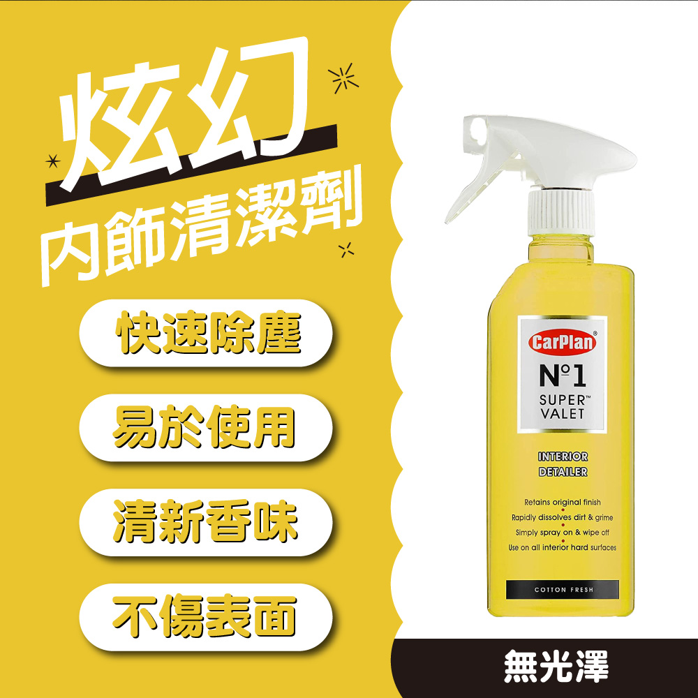 商品介紹‧易於使用-只需噴灑並擦拭即可!‧用於汽車內部硬質材質的快速清潔劑,保留原始光潔度。‧快速去除灰塵、油脂和污垢,留下奢華純棉清新香味。‧適用於塑料飾板、儀表板、橡膠、金屬和鍍鉻。使用方法1.搖勻瓶子並將噴嘴轉到ON。2.噴在表面上。3.用超細纖維布擦拭。4.把布翻過來,擦淨表面。規格說明‧品牌:CarPlan卡派爾‧品名:Nº1 Super valet 炫幻內飾清潔劑‧容量:600ml/罐‧製造商:英國Tetrosyl公司‧產地:英國注意事項‧使用後不會有增加光澤感。‧請先在不顯眼處測試相容性。‧保存時避免放置陽光直射和高溫處。‧請避免讓孩童接觸,若不慎觸及眼睛請以大量清水沖洗並就醫檢查。