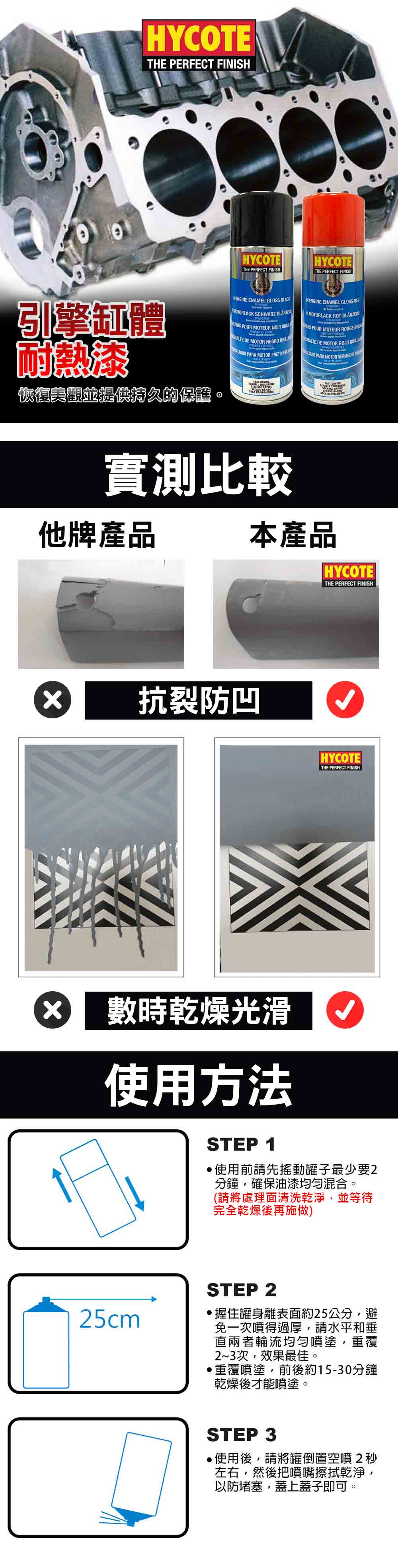 ‧品牌:HYCOTE‧品名:引擎缸體耐熱漆‧顏色:紅色、黑色‧包裝:400ml‧製造商:英國 Tetrosyl 公司‧產地:英國