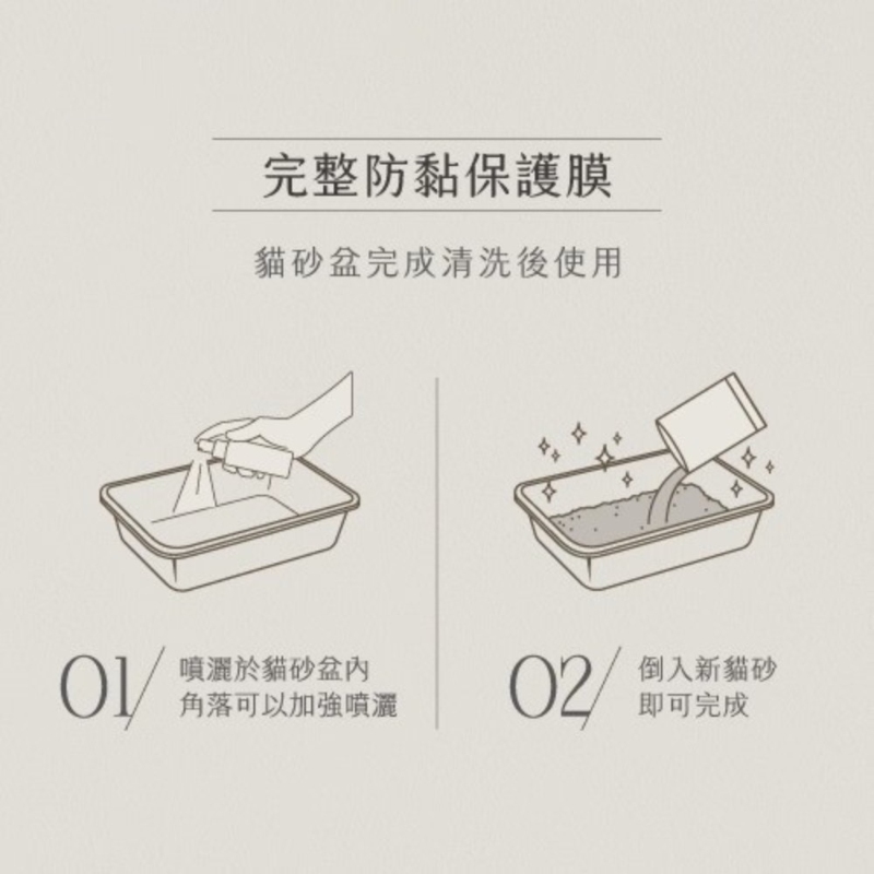 A|每次完整鍍膜約噴4-5下,每2週清洗貓砂一次,可使用約6-8個月。實際使用時間會因貓咪數量、貓砂盆數量及清潔頻率有所不同。
