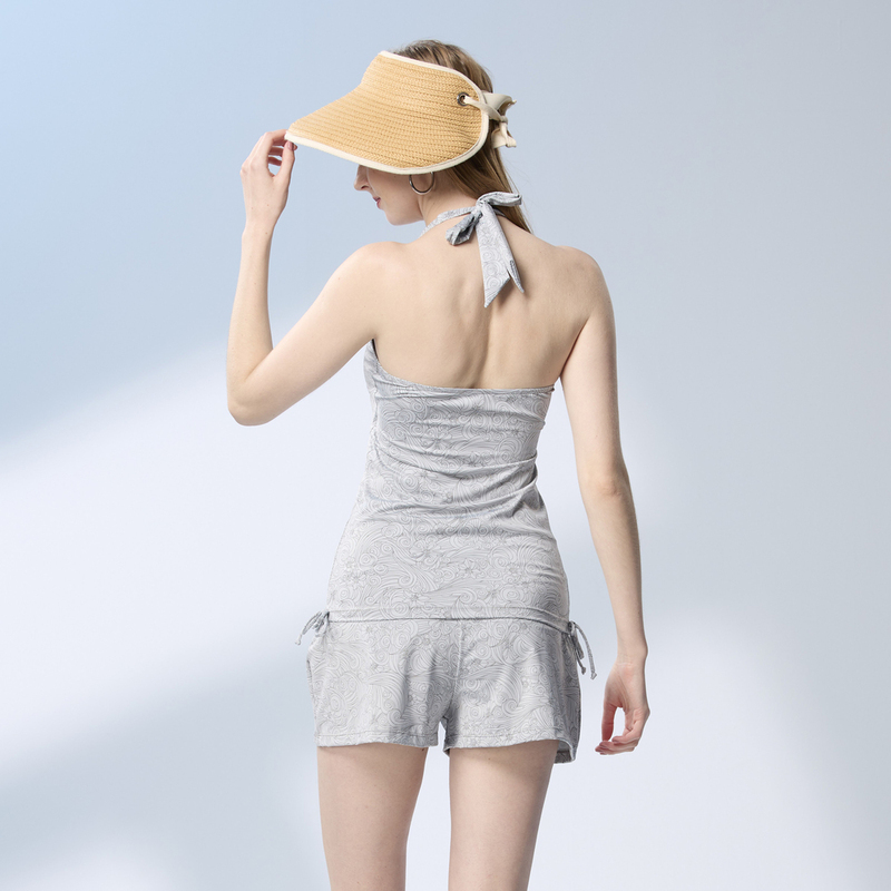 Made in Taiwan, limited edition women's grey backless three-piece swimsuit.