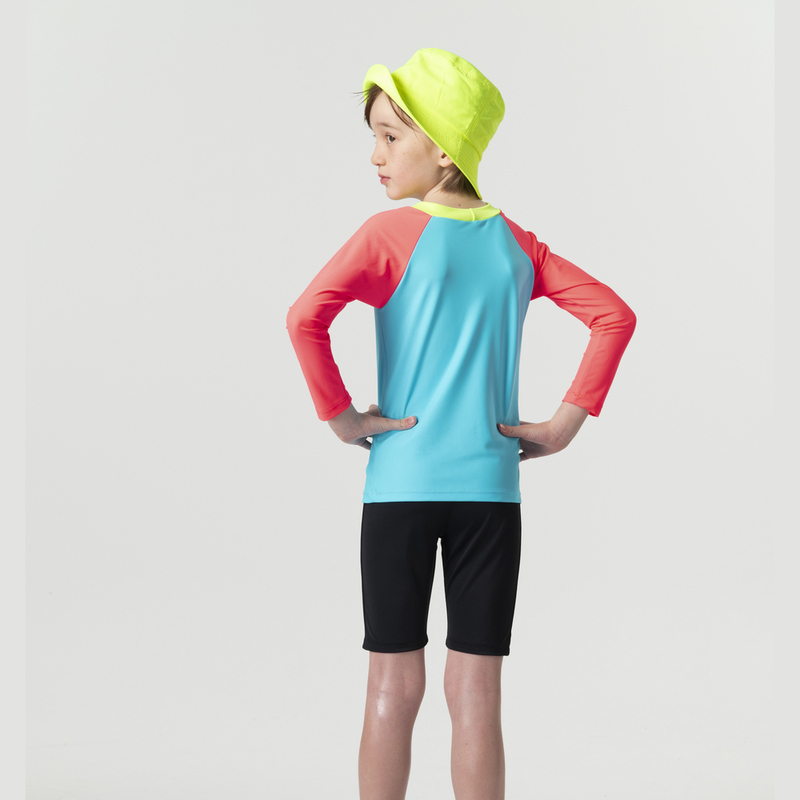 Made in Taiwan. Long-sleeved, UV-resistant, two-piece aurora-patterned swimsuit suitable for both boys and girls.