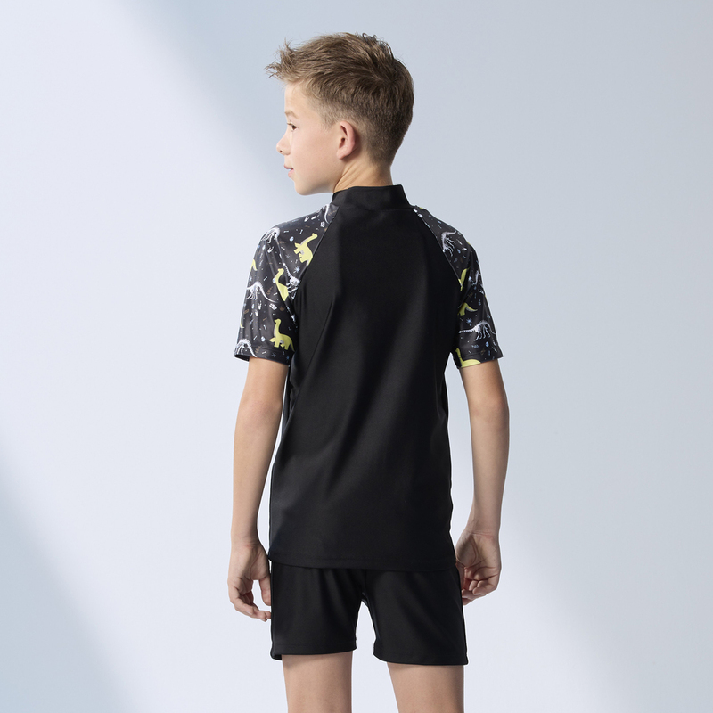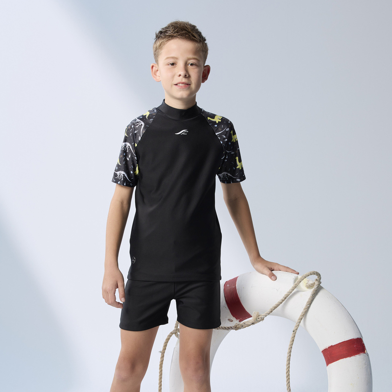 Made in Taiwan. Short-sleeved Jurassic-style two-piece swimsuit for older children, suitable for both boys and girls.