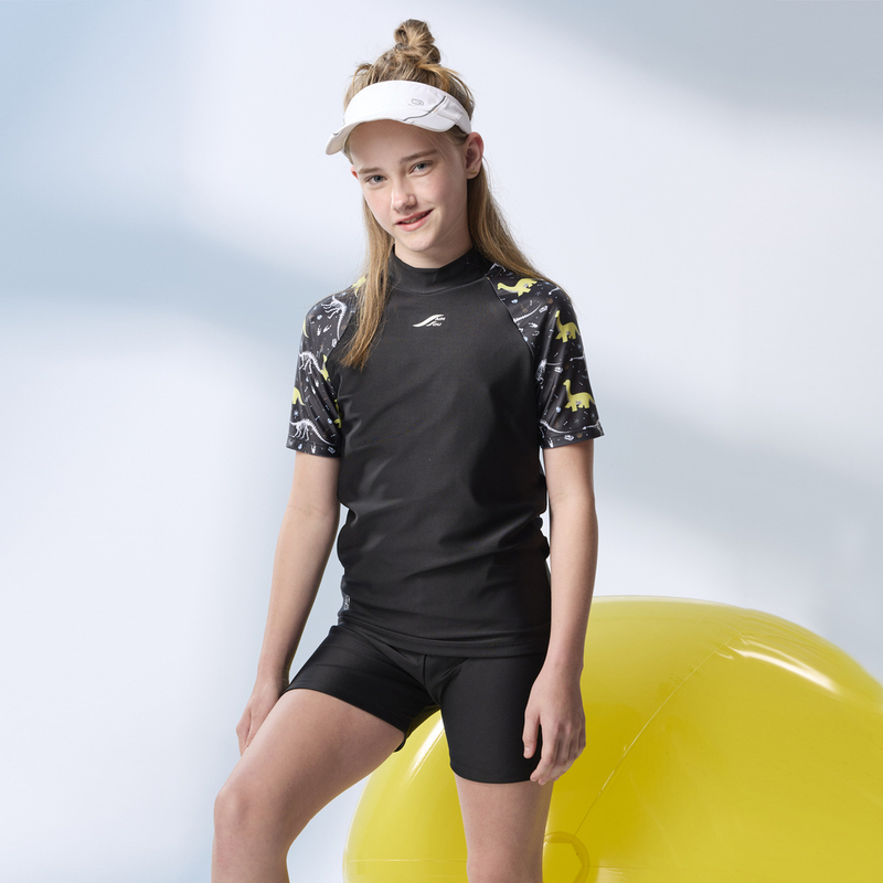 Made in Taiwan. Short-sleeved Jurassic-style two-piece swimsuit for older children, suitable for both boys and girls.