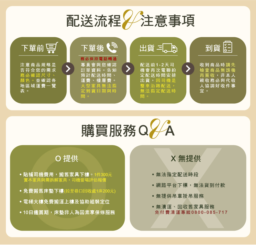 貓抓皮耐磨抗汙木芯板不易長蟲發霉抽屜鋼珠滑軌 注意事項1.出貨:本公司收到訂單後將有專人與您確認訂單 .大型家具無法指定到貨日期與時間由本公司外包貨運司機安排路線出車.7-15天由司機前一天電聯約配安排出貨非人為可控制因素(如天災/下大雨/塞車…等因素)造成無法如期出貨/本公司將延遲到貨或再另約時間安排配送敬請見諒!特殊情況:如因特殊地形(巷弄貨車無法進入/需要吊掛費用)偏遠山區造成司機送貨不便.需要額外收費/會先取得客戶同意後配送!客戶若不同意則取消該筆交易!部分未載名偏遠鄉鎮區域本公司保有出貨與否權利!2.收貨:當您收到商品時請先檢查商品無誤後簽收!商品享有10天鑑賞期(鑑賞期非試用期/退貨請保持商品完整否則會影響您的退貨權益)大型家具若非商品瑕疵(個人喜好因素.訂錯尺寸,,,,等退貨原因)需加收一趟司機取回商品勞務費1500元本公司無提供大型家具回收服務!若需回收請撥打免付費清運專線:0800-085-717