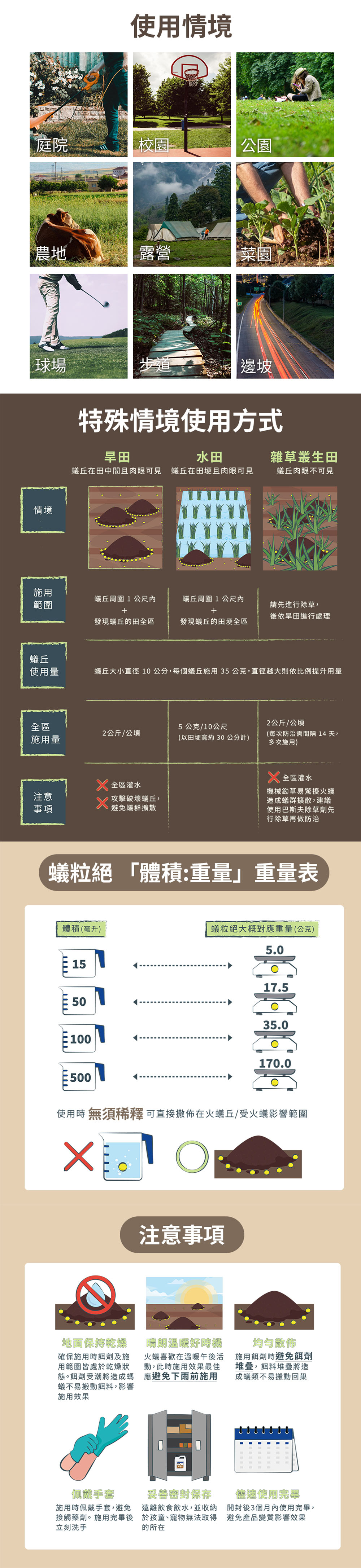 ・使用方法:環繞蟻丘均勻撒布餌劑,吸引工蟻搬回巢內以達整巢防治。