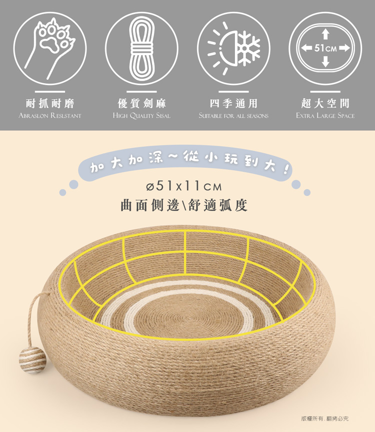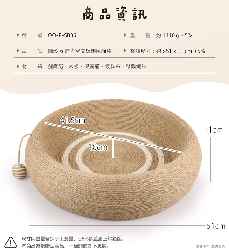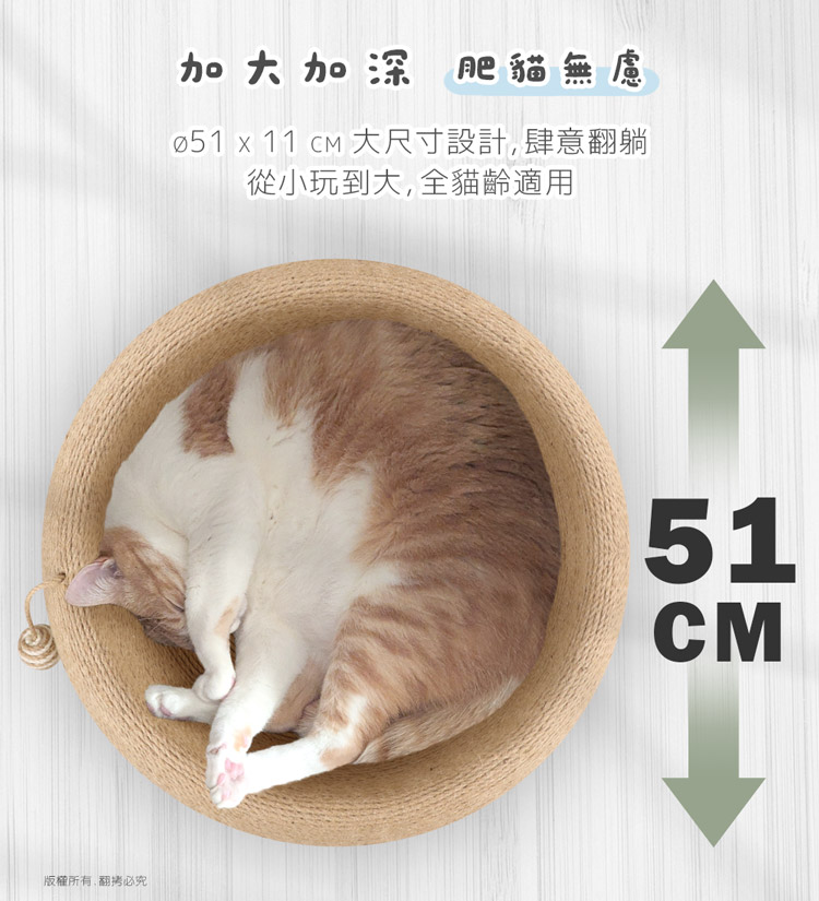 - 品 名:貓本屋 圓形 劍麻深睡大空間貓抓板貓窩