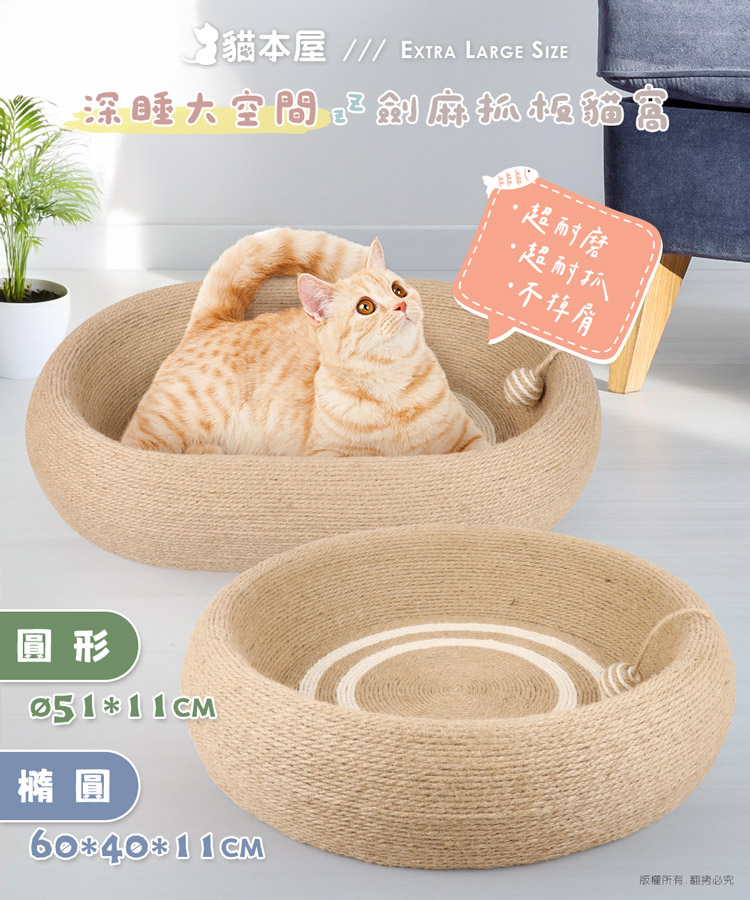 - 品 名:貓本屋 橢圓形 劍麻深睡大空間貓抓板貓窩