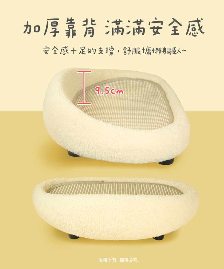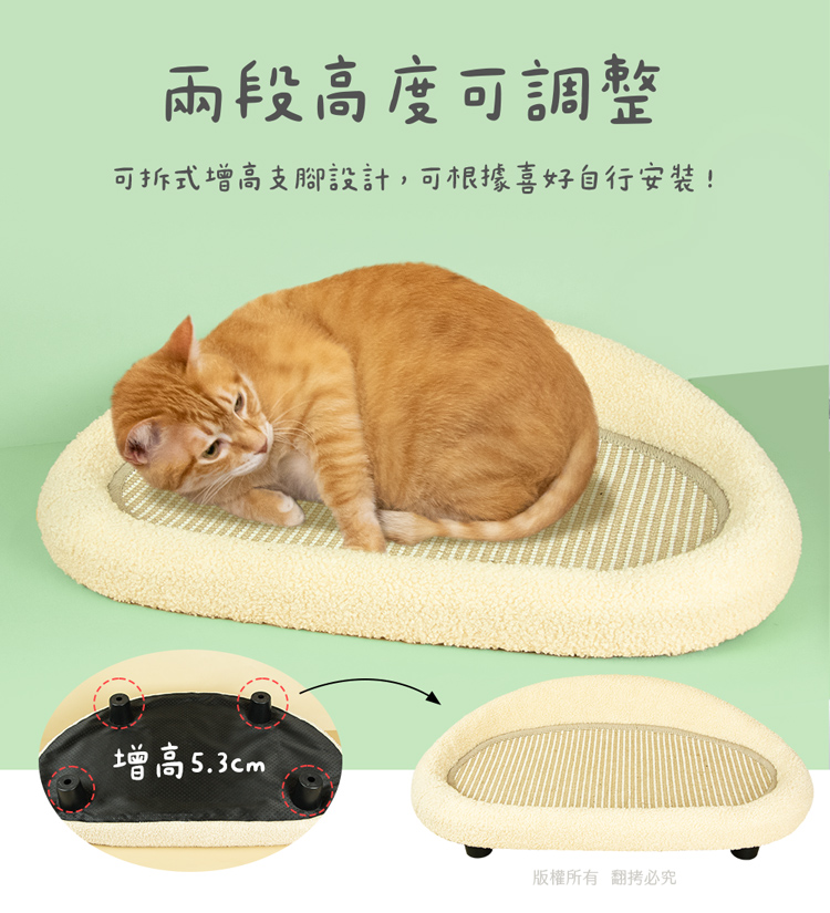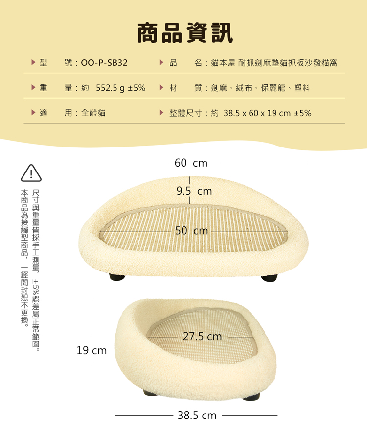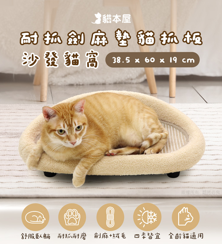 貓本屋 耐抓劍麻墊貓抓板沙發貓窩 --休息貓窩結合劍麻抓板,一物多用途----貓窩/貓床/貓抓板/磨爪,優質耐抓編織劍麻-- 輕鬆簡單組裝,將『休息貓窩』與『劍麻貓抓板』完美結合!立刻讓貓咪擁有一個可玩樂/磨爪/休息的地方! 貓窩採用舒適絨毛布包覆,全貓齡皆適用,玩累時可舒適躺臥精選耐磨劍麻繩編織而成的貓抓墊,結實耐用不易掉屑是兼顧美感與功能的寵物家俱好選擇。 注意事項: .本商品為接觸型商品,為避免傳染性疾病(如:跳蚤/壁虱/疥癬…等) 一經開封或試用過,恕不受理更換事宜。.購買前仔細詳閱商品規格尺寸,慎重購買,以免造成日後買賣糾紛。.本產品僅用於寵物使用,切勿用於其他用途。.商品圖檔顏色因電腦螢幕設定差異會略有不同,以實際商品顏色為準。.尺寸與重量皆採手工測量,±5%誤差屬正常範圍。 轉載敬告: 鈞嵐(立嵐)之商品圖文、影片或商標等,皆屬鈞嵐(立嵐)版權所有, 若未經同意即任意轉載刊登者,我司將進行相關智慧財產著作權與 商標權及商業法的追訴權利。 商品規格: .型 號:OO-P-SB32.品 名:貓本屋 耐抓劍麻墊貓抓板沙發貓窩.整體尺寸:整 體 約 38.5 x 60 x 19 cm (±5%/最大外徑) 劍麻墊 約 27.5 x 50 x 1 cm (±5%/使用內徑).重 量:約 552.5 g (±5%).材 質:劍麻、絨布、保麗龍、塑料.包裝內含:沙發躺椅 x1、支腳 x4、腳墊 x4、螺絲 x4、螺絲起子 x1.商品保固:僅限新品瑕疪更可換商品.產 地:中國大陸