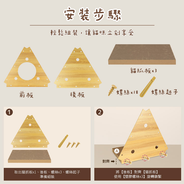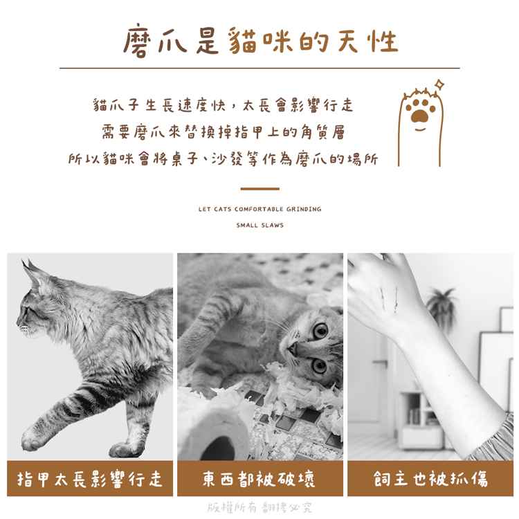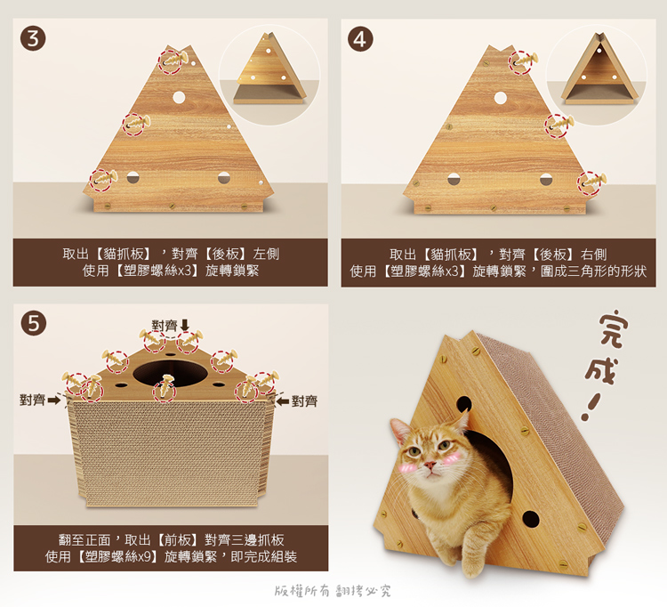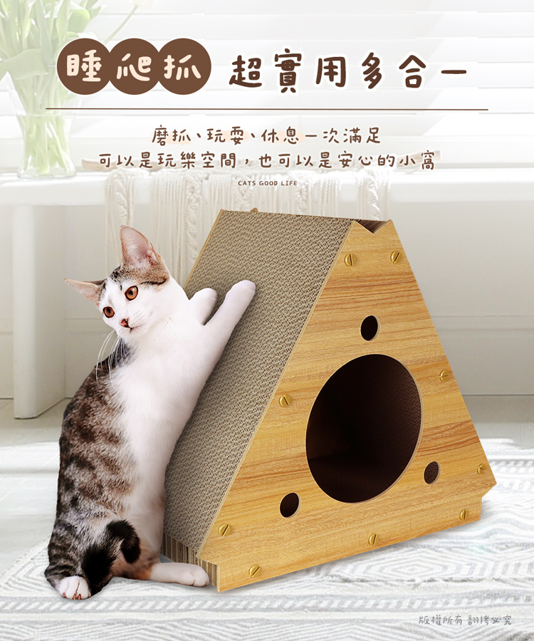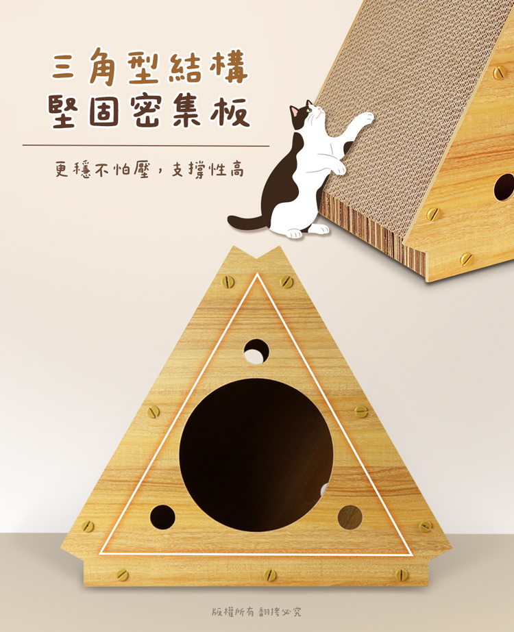 貓本屋 三角形立式貓抓板貓窩 ★內外皆為貓抓板★ --高密度瓦楞紙+密集板,三角型可任意翻面-- 高密度瓦楞紙板+密集板,可爬可抓玩累了還可躺進屋內,玩樂與休息合而為一! 裏3面+外3面,6面皆為貓抓板,隨時磨爪,穩固不怕壓,讓大貓小貓都可玩翻天!注意事項: .本商品為接觸型商品,為避免傳染性疾病(如:跳蚤/壁蝨/疥癬…等) 一經開封或試用過,恕不受理更換事宜。.購買前仔細詳閱商品規格尺寸,慎重購買,以免造成日後買賣糾紛。.此商品屬瓦楞紙製品,在製作上由於裁剪工藝的原因,難免會有些許 切割裁剪留下的痕跡,屬正常情況非瑕疵!.本產品僅供寵物使用,禁止兒童攀爬,以免造成危險。.所有的規格與重量皆採手工測量,誤差±3%屬正常範圍。 轉載敬告: 鈞嵐(立嵐)之商品圖文、影片或商標等,皆屬鈞嵐(立嵐)版權所有, 若未經同意即任意轉載刊登者,我司將進行相關智慧財產著作權與 商標權及商業法的追訴權利。 商品規格: .型 號:OO-P-SB33.品 名:貓本屋 三角形立式貓抓板貓窩.款 式:木紋.尺 寸:約 28 x 40.5 x 40 cm ±3%.重 量:約 1430 g ±3%.材 質:密集板+瓦楞紙.包裝內含:密集板 x2、貓抓板 x3、螺絲起子 x1、 塑膠螺絲 x18.商品保固:僅限新品瑕疵更可換商品.產 地:中國大陸