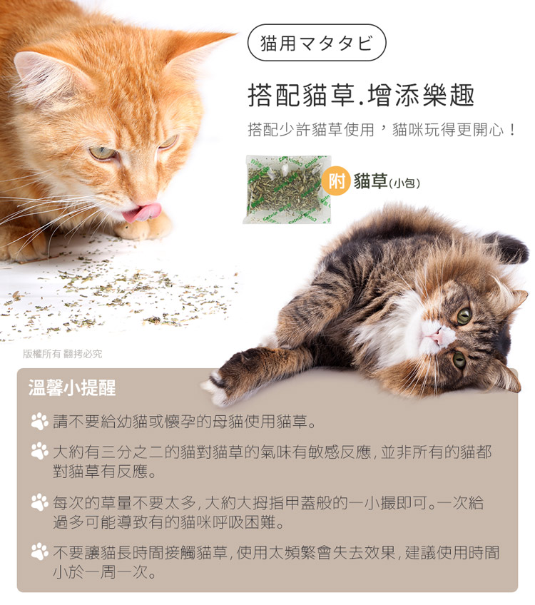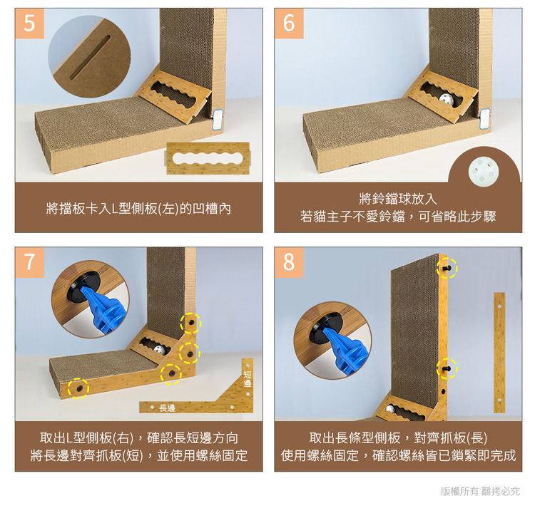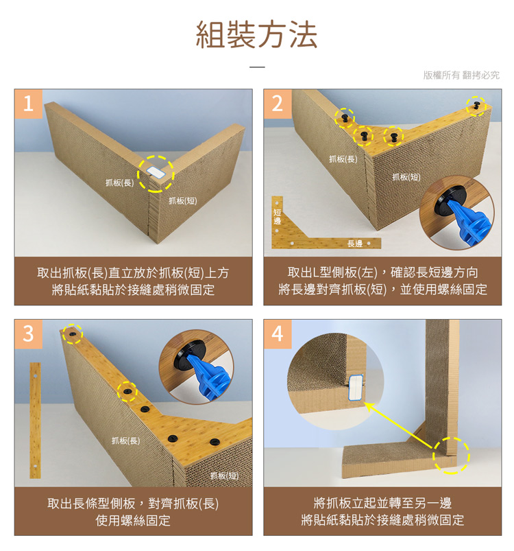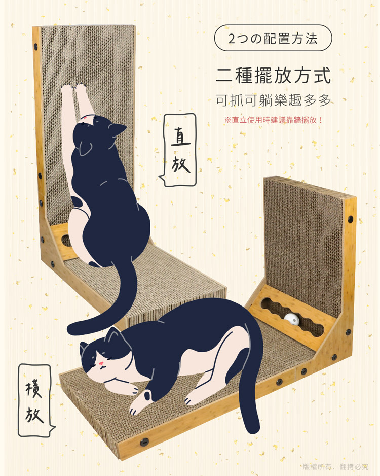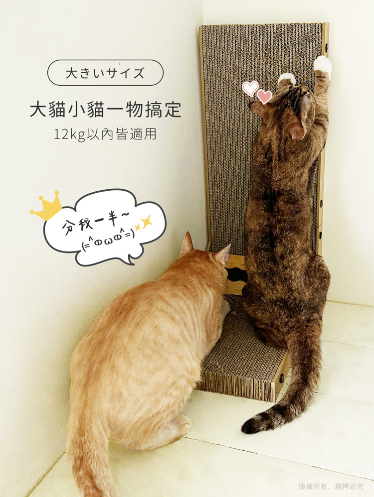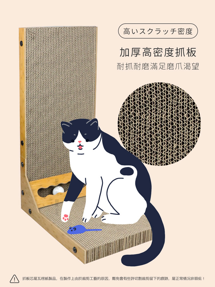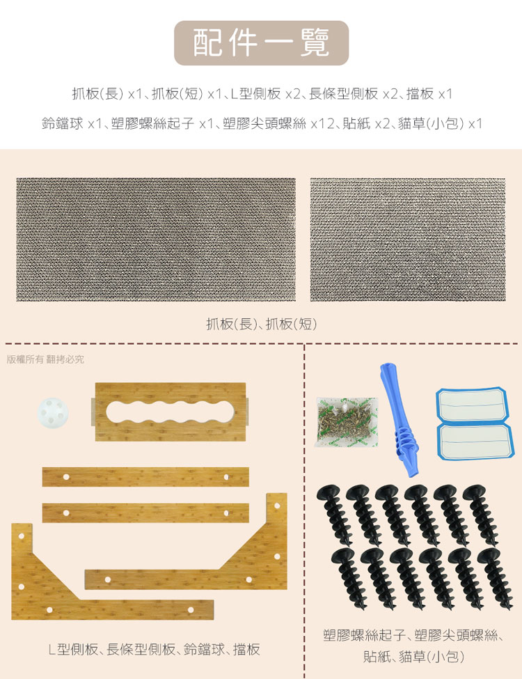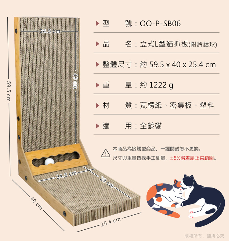 貓本屋 立式L型貓抓板(附鈴鐺球)★二種擺放方式,可抓可躺★ --加厚高密度抓板芯,大尺寸直立式設計,滿足貓咪想站著抓的心情-- 側板採用固密集板搭配加厚高密度抓板芯,直立式設計,滿足貓咪的磨爪需求,站著抓盡情發洩,簡易組裝輕鬆上手,搭配軌道鈴鐺玩具球盡情釋放貓咪天性,避免傢俱與慘遭毒手! 二種擺放方式,直放使貓咪可站立磨爪,橫放使貓咪可躺臥休息可抓可躺樂趣多多,可搭配少許貓草使用,使貓咪玩得更開心!趕快讓貓咪擁有一個可以磨爪/磨蹭/玩樂/休息的立式抓板吧! ※直立使用時建議靠牆擺放!※適用於12kg以內全齡貓。 注意事項: .本商品為接觸型商品,為避免傳染性疾病(如:跳蚤/壁虱/疥癬…等) 一經開封或試用過,恕不受理更換事宜。.請遠離高溫源(如:暖氣、火爐…等),以免不慎點燃。.請避免放置於水源或是水氣多的地方,避免瓦楞紙受潮軟化。.本產品僅供寵物使用,請勿做其他用途。.抓板芯屬瓦楞紙製品,在製作上由於裁剪工藝的原因,難免會有些許 切割裁剪留下的痕跡,屬正常情況非瑕疪!.購買前仔細詳閱商品規格尺寸,慎重購買,以免造成日後買賣糾紛。.尺寸與重量皆採手工測量,±5%誤差屬正常範圍。 轉載警示: 自民國108年6月1日起(含追溯既往),鈞嵐(立嵐)企業有限公司之 商品圖片、影片或鈞嵐(立嵐)企業有限公司文字及LOGO, 任何客戶或用戶需轉載刊登任何圖片、文字、影片 皆需經過鈞嵐(立嵐)書面同意,如有需求請與鈞嵐(立嵐)客服中心接洽聯絡。 若任何未經鈞嵐(立嵐)同意即任意轉載刊登者, 我司將進行相關智慧財產著作權與商標權及商業法的追訴權利。 商品規格: .型 號:OO-P-SB06.品 名:貓本屋 立式L型貓抓板(附鈴鐺球).整體尺寸:約 59.5 x 40 x 25.4 cm ±5%.重 量:約 1222 g ±5%.適 用:全齡貓.包裝內含:抓板(長) x1、抓板(短) x1、L型側板 x2、長條型側板 x2、 擋板 x1、鈴鐺球 x1、塑膠螺絲起子x1、塑膠尖頭螺絲 x12、 貼紙 x2、貓草(小包) x1.商品保固:僅限新品瑕疪更可換商品.產 地:中國大陸