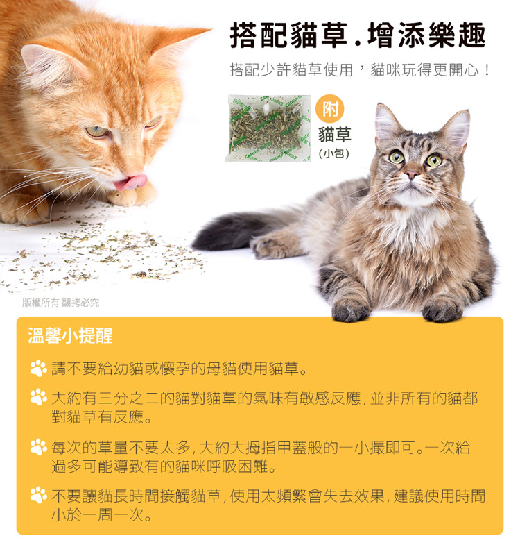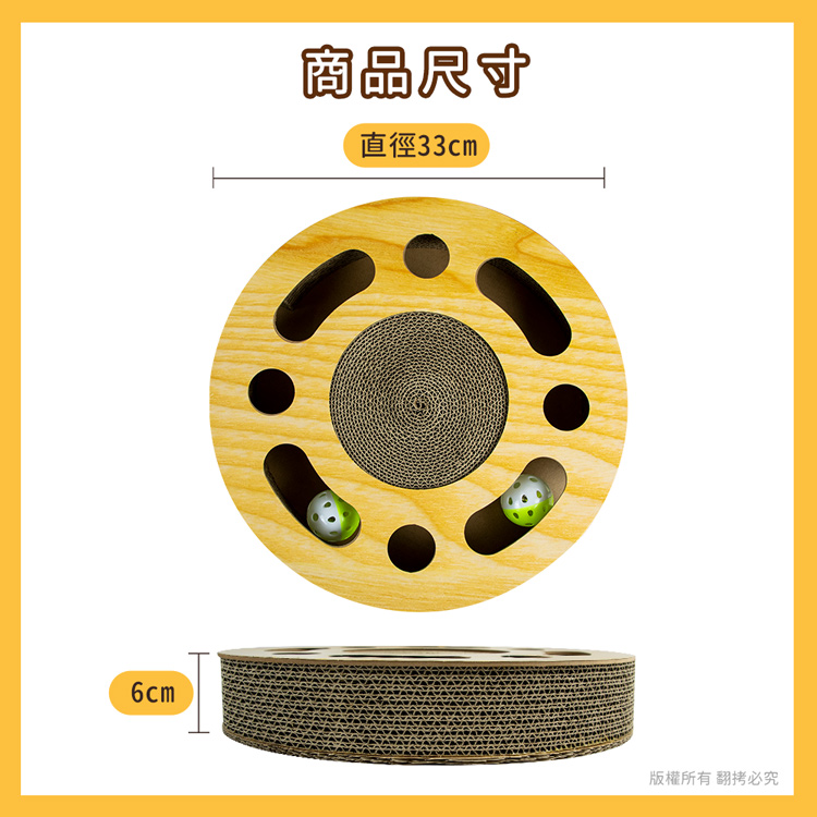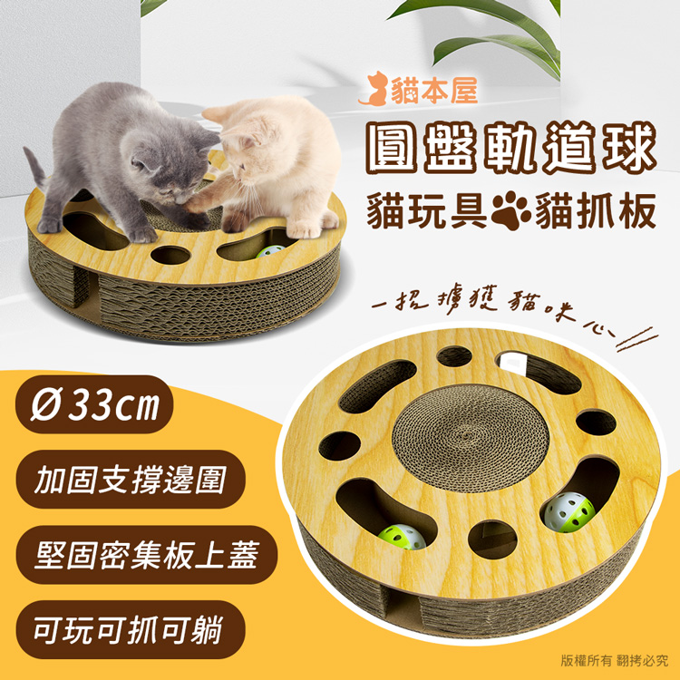 貓本屋 圓盤軌道球 貓玩具/貓抓板(Ø33cm) --多種玩法,適於全齡貓,結實高壓黏合,好玩不易變型-- 面對高冷主子卻無從下手?只有抓板或逗貓棒是行不通的,快來試試圓盤軌道球貓玩具抓板吧! 上層堅固密集板,支撐性強不易塌陷,同時搭配高密度瓦楞紙結實高壓黏合,內部再放入小鈴鐺球,在中間環軌道滾動,引起貓主子的好奇心伸入抓玩,趣味性十足! ※鈴鐺球顏色採隨機出貨!※本產品僅用於寵物使用,切勿用於其他用途。※本商品為接觸型商品,為避免傳染性疾病(如:跳蚤/壁虱/疥癬…等) 一經開封或試用過,恕不受理更換事宜。 注意事項: .本商品為接觸型商品,為避免傳染性疾病(如:跳蚤/壁虱/疥癬…等) 一經開封或試用過,恕不受理更換事宜。.購買前仔細詳閱商品規格尺寸,慎重購買,以免造成日後買賣糾紛。.本產品僅用於寵物使用,切勿用於其他用途。.商品圖檔顏色因電腦螢幕設定差異會略有不同,以實際商品顏色為準。.所有的尺寸與重量皆採手工測量,誤差±3%屬正常範圍。 轉載警示: 自民國108年6月1日起(含追溯既往),鈞嵐(立嵐)企業有限公司之 商品圖片、影片或鈞嵐(立嵐)企業有限公司文字及LOGO, 任何客戶或用戶需轉載刊登任何圖片、文字、影片 皆需經過鈞嵐(立嵐)書面同意,如有需求請與鈞嵐(立嵐)客服中心接洽聯絡。 若任何未經鈞嵐(立嵐)同意即任意轉載刊登者, 我司將進行相關智慧財產著作權與商標權及商業法的追訴權利。 產品規格: .商品型號:OO-P-SB07.商品名稱:貓本屋 圓盤軌道球 貓玩具/貓抓板.尺 寸:約 Ø 33 x 6 cm (±3%/最大外徑).重 量:約 450 g (±3%/含鈴鐺球).適用範圍:全齡貓.材 質:密集板、瓦楞紙、.包裝內含:圓盤貓抓板 x1、鈴鐺球(隨機色) x2、貓草(小包) x1.商品保固:僅限新品瑕疪可更換商品.產 地:中國大陸