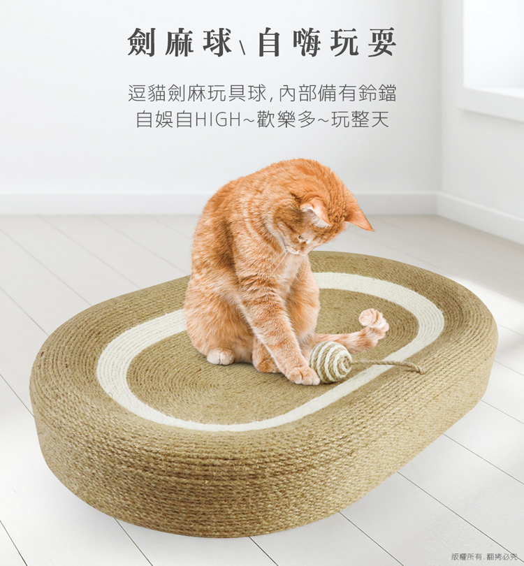 正面採用優質劍麻全包覆設計,耐抓耐磨不易掉碎屑,採用漸近式下凹弧型,可貼合貓咪身型,讓貓主子舒適躺臥,零重力睡眠,安全感滿分。