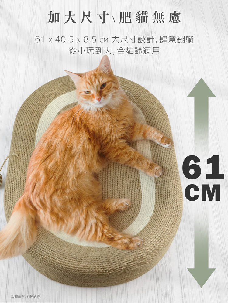 61cm加大SIZE,肥貓無慮肆意翻躺,從小貓玩到大貓,全齡貓適用側邊備有鈴鐺劍麻玩具球,讓貓咪自娛自嗨,快樂一整天! 注意事項: .本商品為接觸型商品,為避免傳染性疾病(如:跳蚤/壁虱/疥癬…等) 一經開封或試用過,恕不受理更換事宜。.購買前仔細詳閱商品規格尺寸,慎重購買,以免造成日後買賣糾紛。.所有的規格與重量皆採手工測量,誤差±5%屬正常範圍。 轉載警示: 自民國108年6月1日起(含追溯既往),鈞嵐(立嵐)企業有限公司之 商品圖片、影片或鈞嵐(立嵐)企業有限公司文字及LOGO, 任何客戶或用戶需轉載刊登任何圖片、文字、影片 皆需經過鈞嵐(立嵐)書面同意,如有需求請與鈞嵐(立嵐)客服中心接洽聯絡。 若任何未經鈞嵐(立嵐)同意即任意轉載刊登者, 我司將進行相關智慧財產著作權與商標權及商業法的追訴權利。 商品規格: .型 號:OO-P-SB13.品 名:貓本屋 特大號劍麻貓抓板貓窩.尺 寸:約 61 x 40.5 x 8.5 cm ±5%.重 量:約 819 g.材 質:劍麻繩、紡織物、板料布、聚酯纖維.包裝內含:劍麻貓抓板貓窩 x1.商品保固:僅限新品瑕疪更可換商品.產 地:中國大陸
