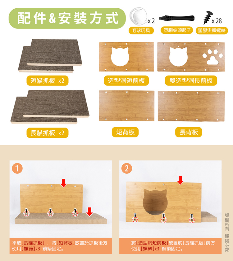 貓本屋 超長貓隧道 雙層貓抓板(L/XL號)★貓主子喜歡的都在這★ --100cm超長通道,自由穿梭其中,攀爬+磨爪+躲藏空間----磨爪休息兩不誤,臥躺無憂,適於全齡貓-- 愛玩是貓的天性,而磨爪子會讓牠們感到開心!左右雙出口,100cm超長通道設計,自由穿梭其中~ 頂層長抓板,可攀爬設計,爬上爬下的不亦樂乎~前置三個造型洞口,方便窺探,同時俱備透氣與隱密性,前後板皆採用密集板設計,結構緊密牢固耐用! 給愛玩的貓咪磨爪子滿足天性!是兼具動與靜多功能的設計,不論是喜歡躲藏的,還是懶洋洋的貓主子,都是值得入手的必備好物!立刻讓貓咪擁有一個可以玩樂/磨抓/休息的地方! 注意事項: .玩具毛球顏色為隨機搭配!.本商品為接觸型商品,為避免傳染性疾病(如:跳蚤/壁蝨/疥癬…等) 一經開封或試用過,恕不受理更換事宜。.請遠離高溫源(如:暖氣、火爐…等),以免不慎點燃。.請避免放置於水源或是水氣多的地方,避免瓦楞紙與密集板受潮。.本產品僅供寵物使用,請勿做其他用途。.此商品內附的瓦楞紙屬於紙製品,在製作上由於裁剪工藝的原因,難免 會有些許切割裁剪留下的痕跡,屬正常情況非瑕疪!.購買前仔細詳閱商品規格尺寸,慎重購買,以免造成日後買賣糾紛。.本產品僅用於寵物使用,切勿用於其他用途。.商品圖檔顏色因電腦螢幕設定差異會略有不同,以實際商品顏色為準。.尺寸與重量皆採手工測量,±5%誤差屬正常範圍。 轉載敬告: 鈞嵐(立嵐)之商品圖文、影片或商標等,皆屬鈞嵐(立嵐)版權所有, 若未經同意即任意轉載刊登者,我司將進行相關智慧財產著作權與 商標權及商業法的追訴權利。 商品規格: .型 號:OO-P-SB23.品 名:貓本屋 超長貓隧道 雙層貓抓板.尺寸/重量: L號 24 x 100 x 24 cm / 約 2.64 kg XL號 29 x 100 x 30 cm / 約 3.5 kg ※以上尺寸與重量皆採手工測量,誤差±5%屬正常範圍.材 質:瓦楞紙、密集板、塑料.包裝內含:長密集板 x2(有造型洞/無洞)、短密集板 x2(有造型洞/無洞)、 長抓板 x2、短抓板 x2、絨毛球 x2、螺絲起子 x1、 塑膠尖頭螺絲 x28.商品保固:僅限新品瑕疵更可換商品.產 地:中國大陸